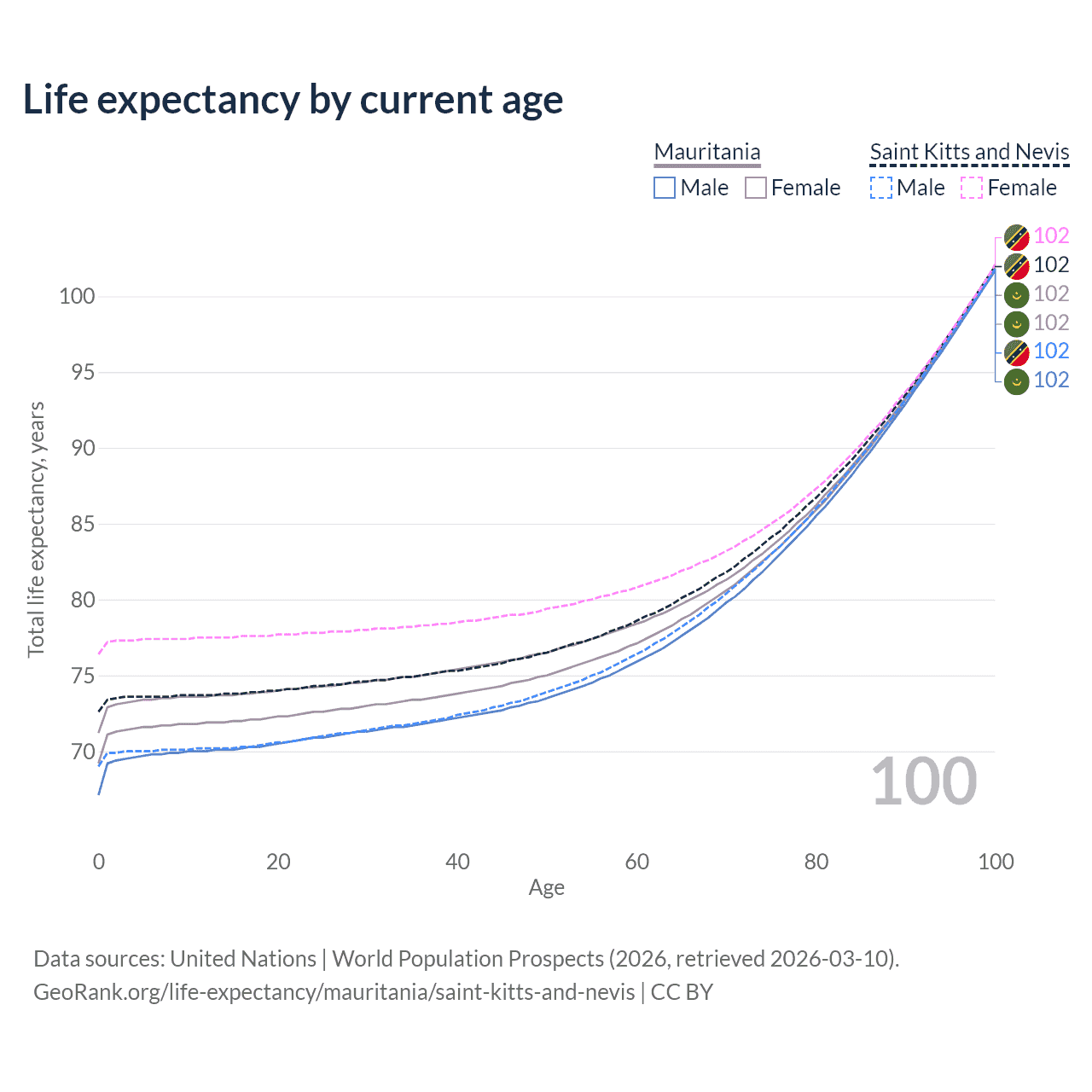 This life expectancy calculator shows the odds of living to 100, 95, 90, and below based on current age for both males and females in Mauritania and Saint Kitts and Nevis, along with mean and median age of death. The calculations are based on the 2026 life tables (actuarial tables) from the UN World Population Prospects.