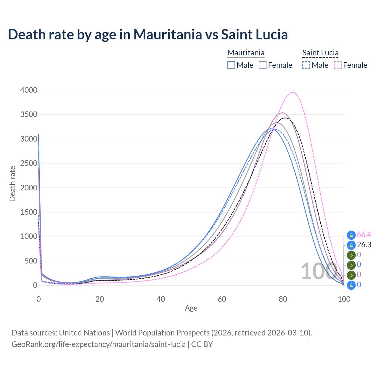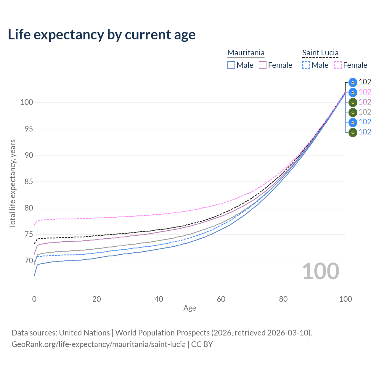 This life expectancy calculator shows the odds of living to 100, 95, 90, and below based on current age for both males and females in Mauritania and Saint Lucia, along with mean and median age of death. The calculations are based on the 2026 life tables (actuarial tables) from the UN World Population Prospects.