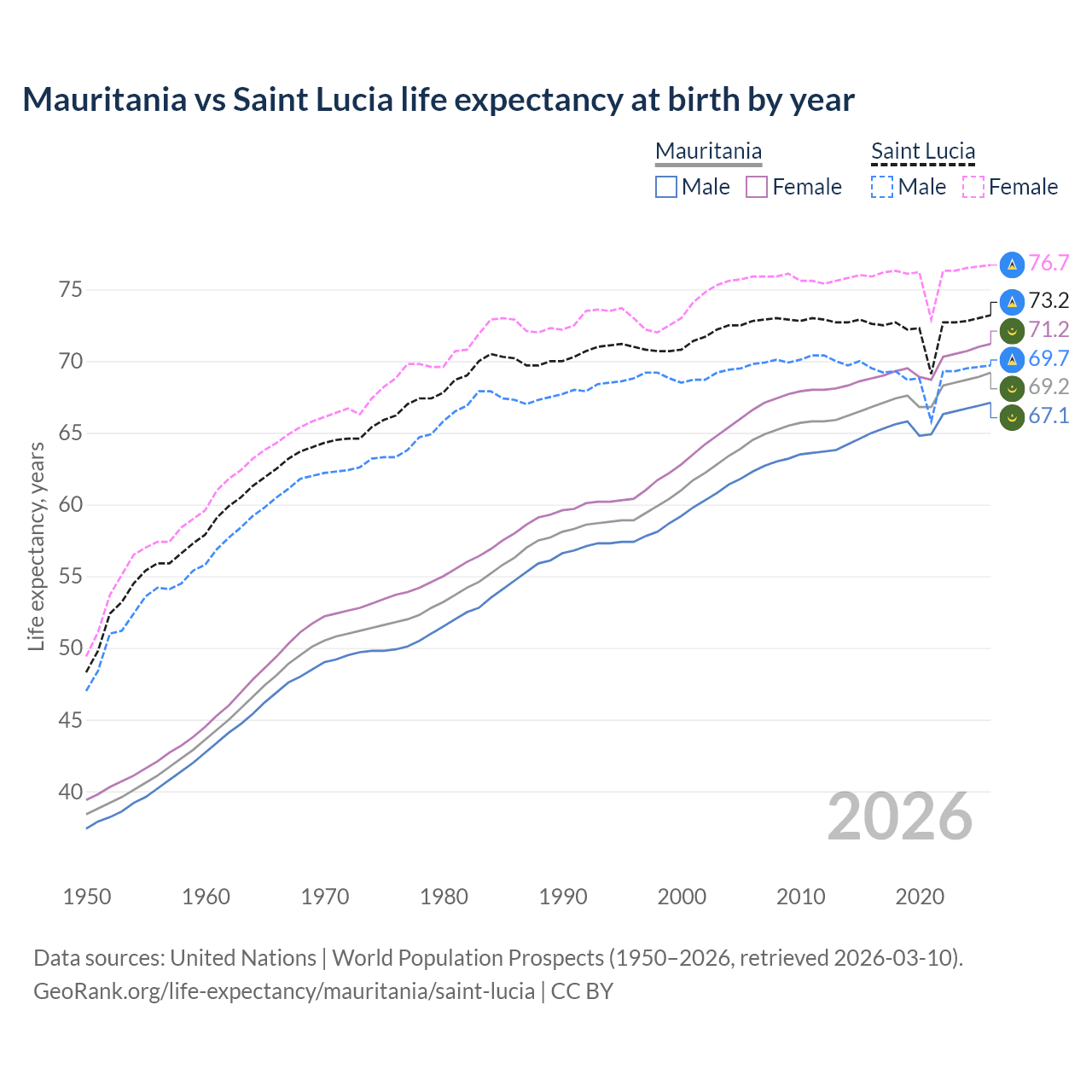 GeoRank.org/life-expectancy/mauritania/saint-lucia | CC BY