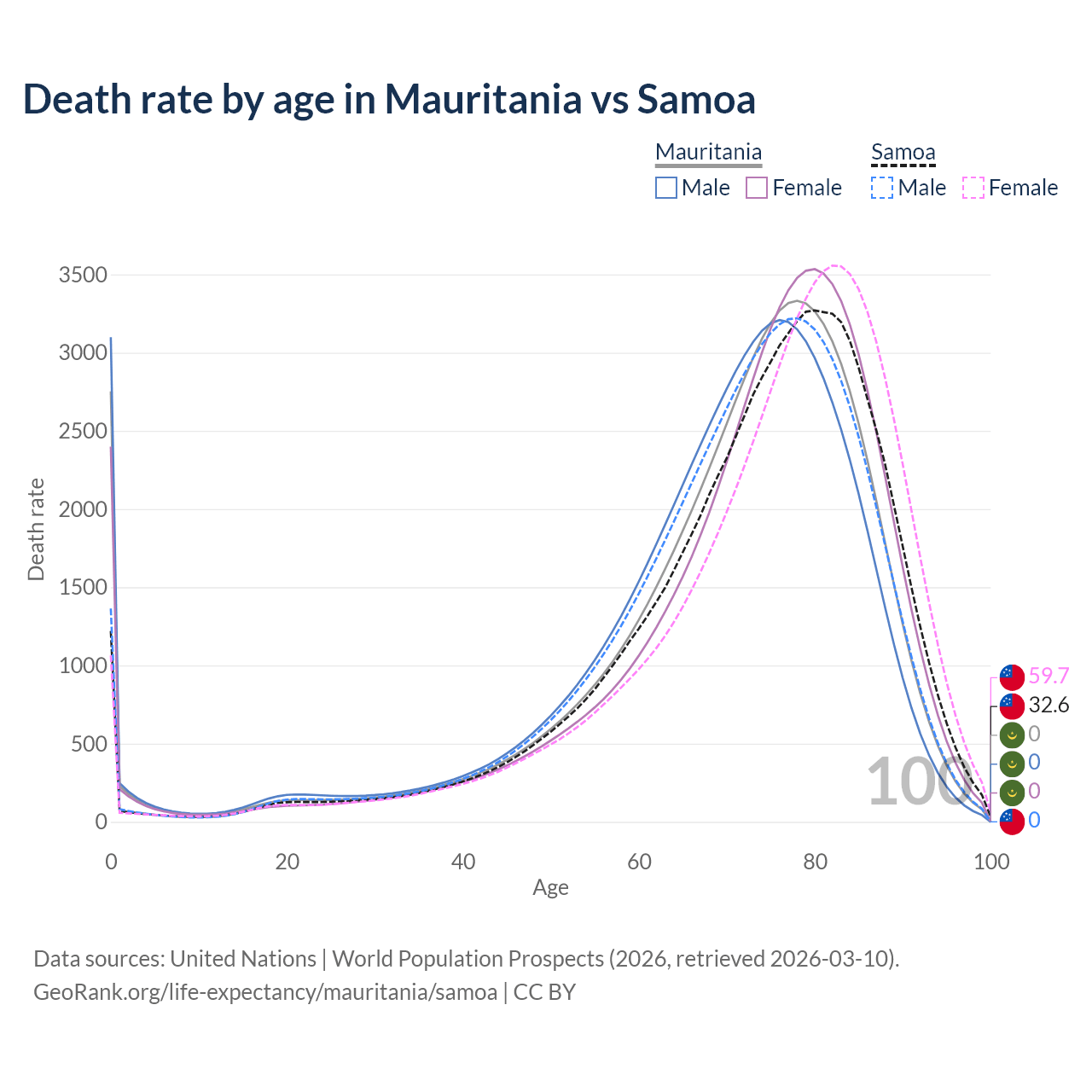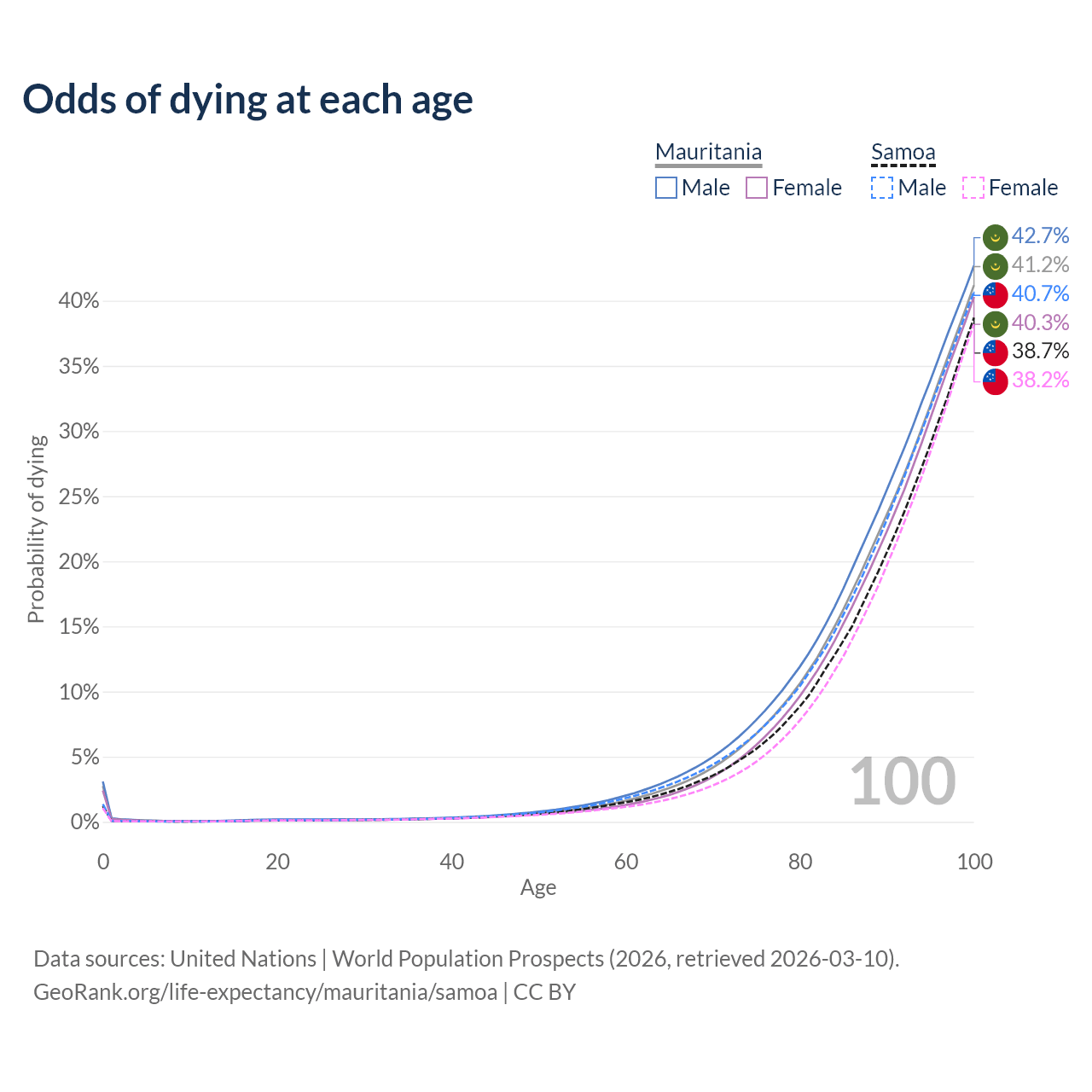 This life expectancy calculator shows the odds of living to 100, 95, 90, and below based on current age for both males and females in Mauritania and Samoa, along with mean and median age of death. The calculations are based on the 2026 life tables (actuarial tables) from the UN World Population Prospects.