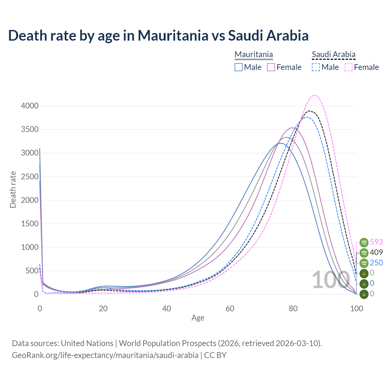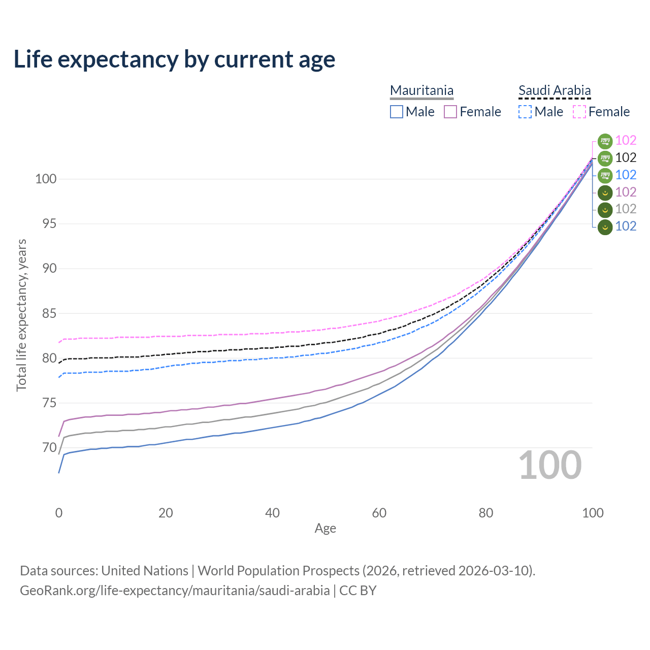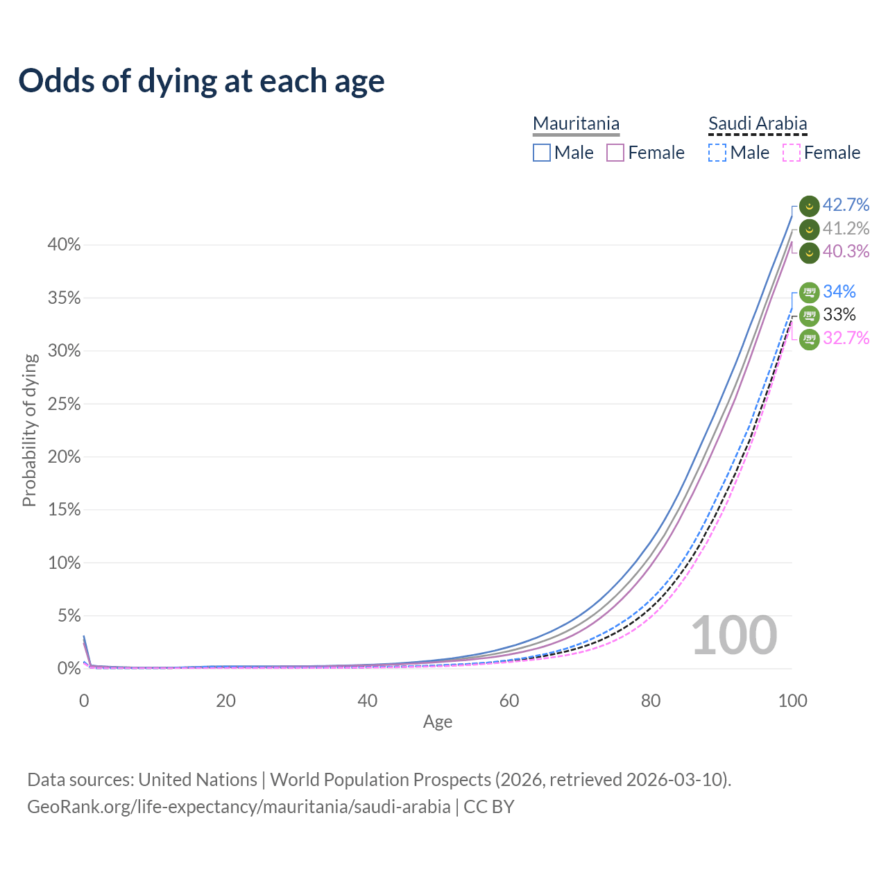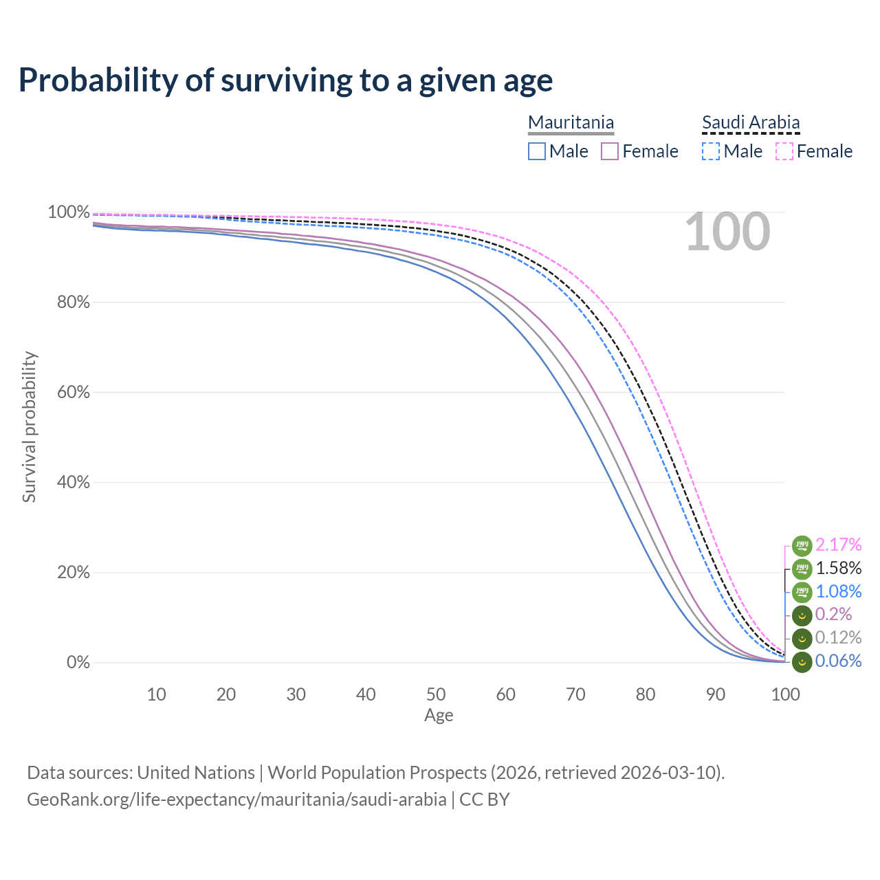This life expectancy calculator shows the odds of living to 100, 95, 90, and below based on current age for both males and females in Mauritania and Saudi Arabia, along with mean and median age of death. The calculations are based on the 2026 life tables (actuarial tables) from the UN World Population Prospects.