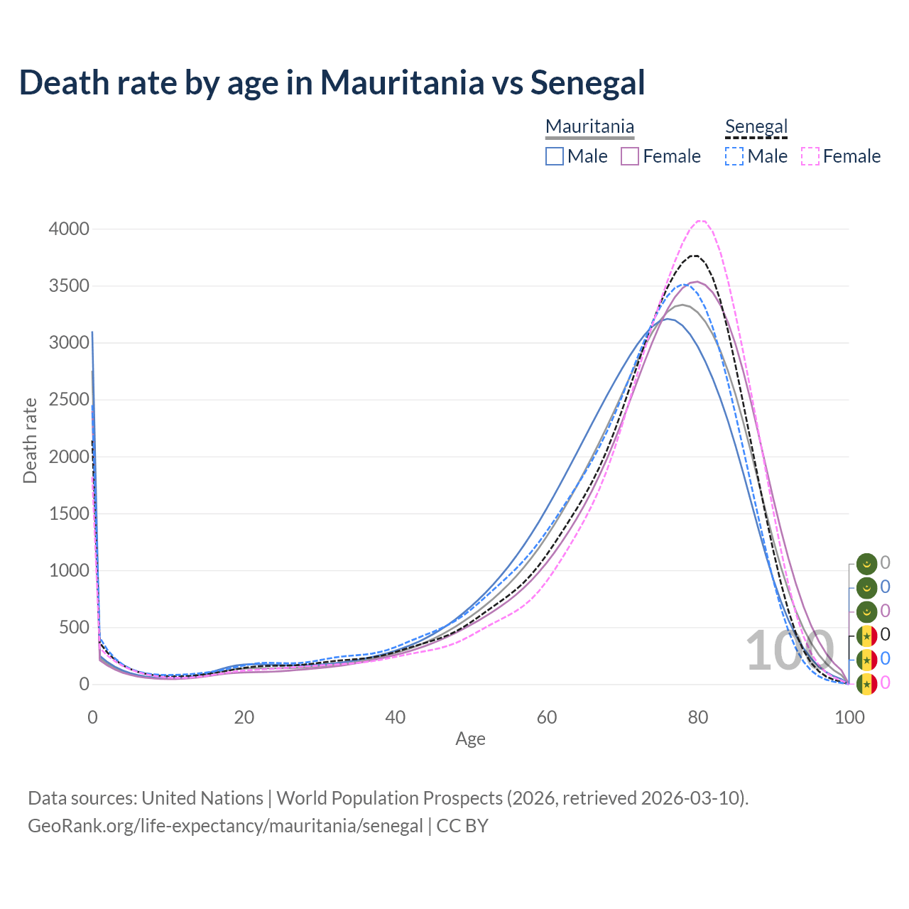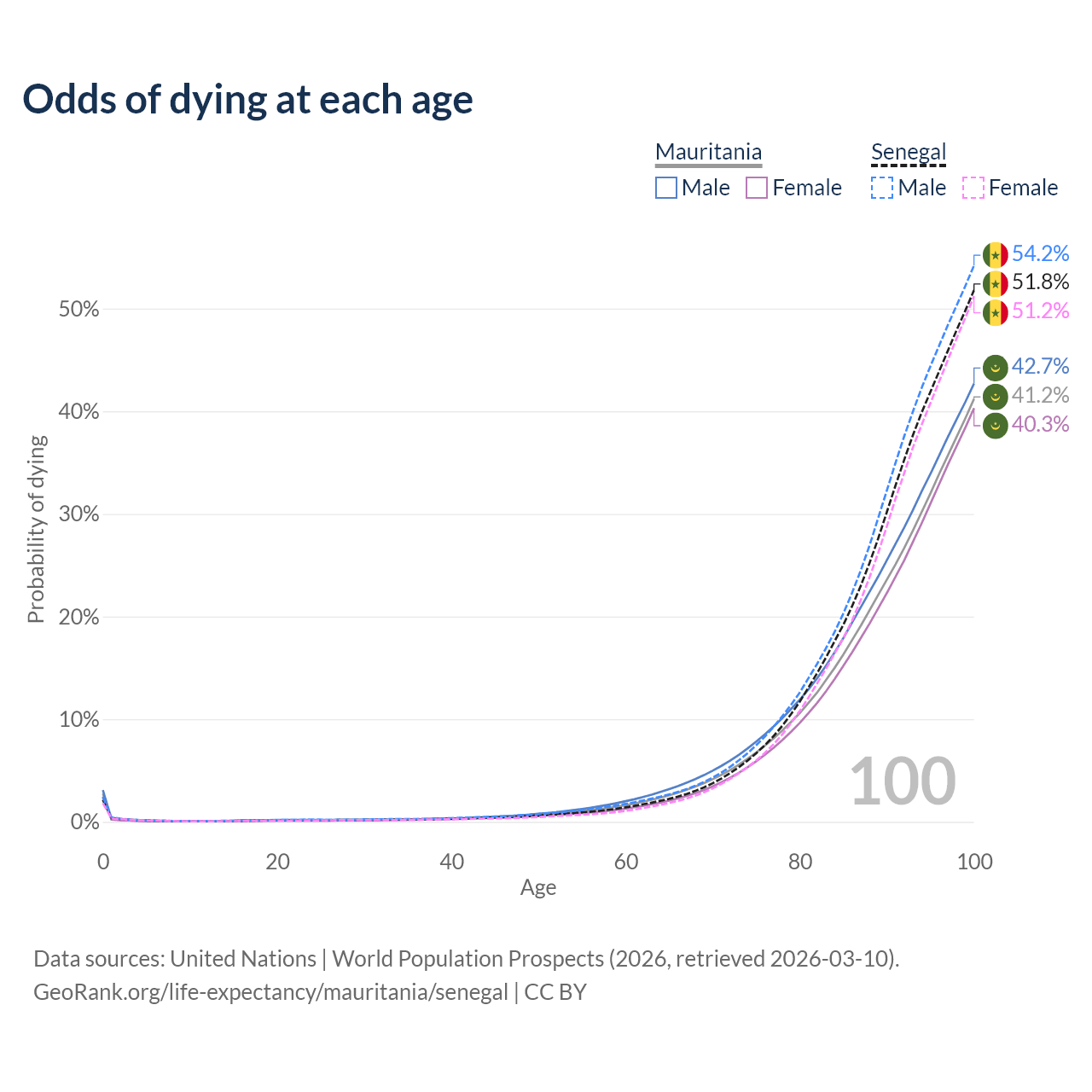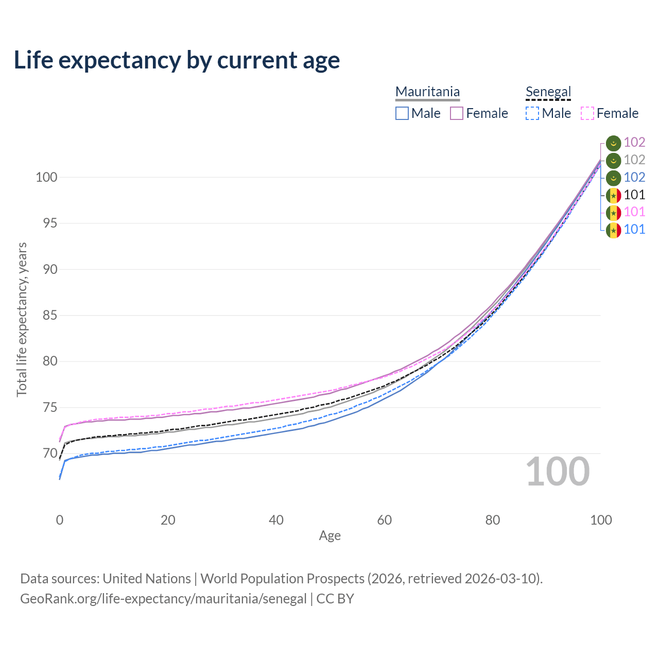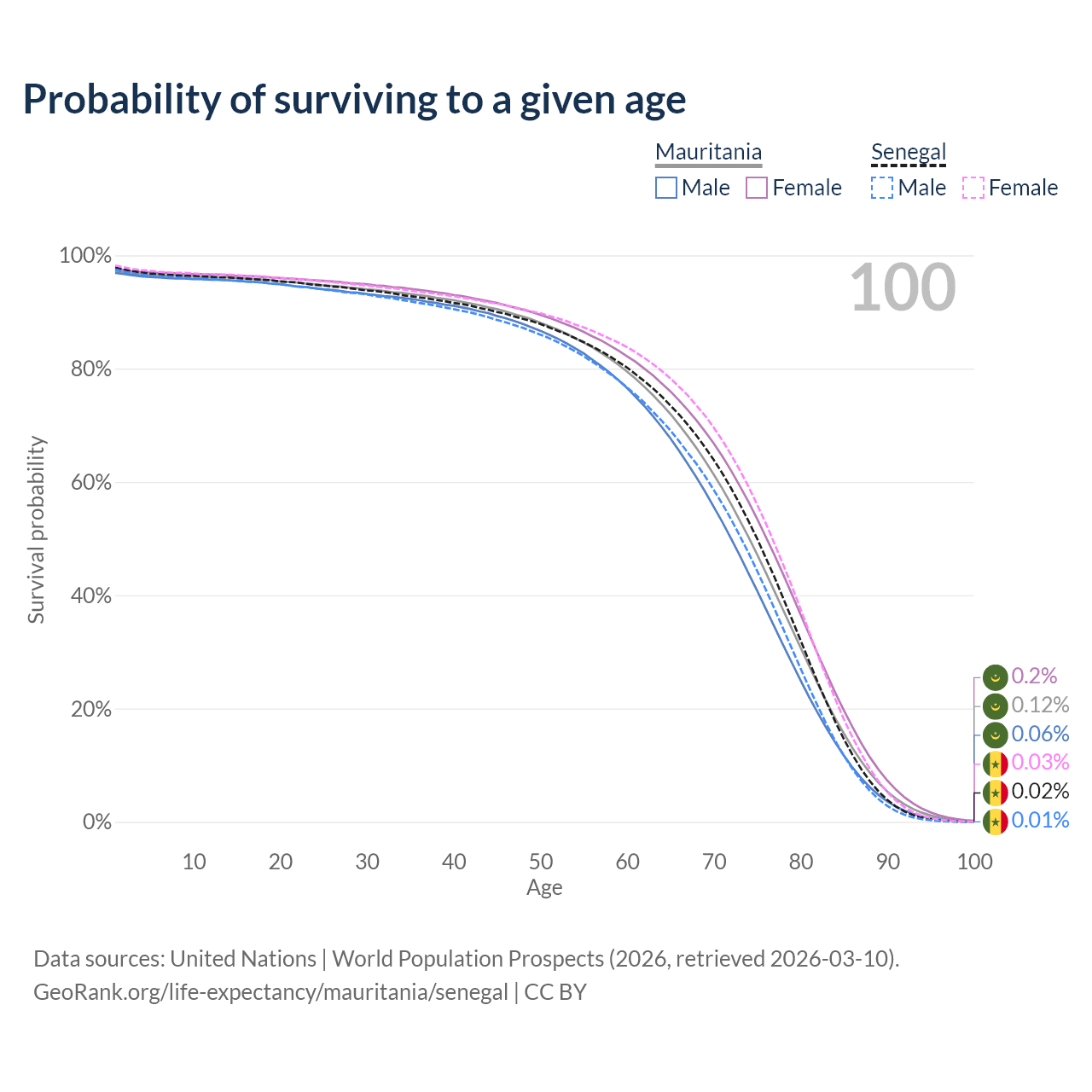 This life expectancy calculator shows the odds of living to 100, 95, 90, and below based on current age for both males and females in Mauritania and Senegal, along with mean and median age of death. The calculations are based on the 2026 life tables (actuarial tables) from the UN World Population Prospects.