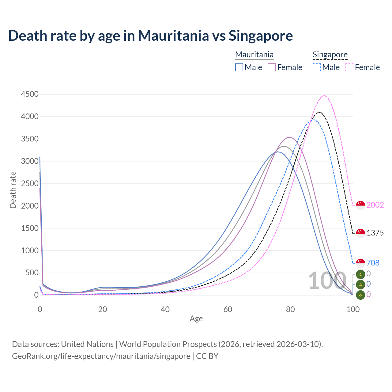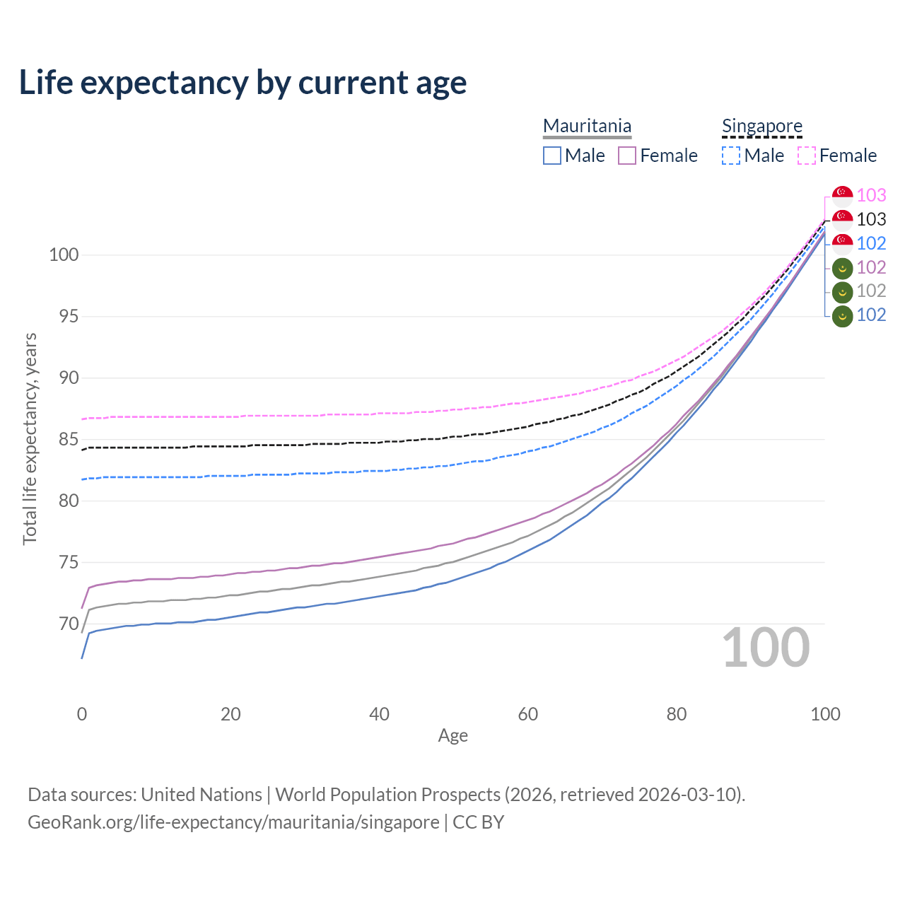 This life expectancy calculator shows the odds of living to 100, 95, 90, and below based on current age for both males and females in Mauritania and Singapore, along with mean and median age of death. The calculations are based on the 2026 life tables (actuarial tables) from the UN World Population Prospects.