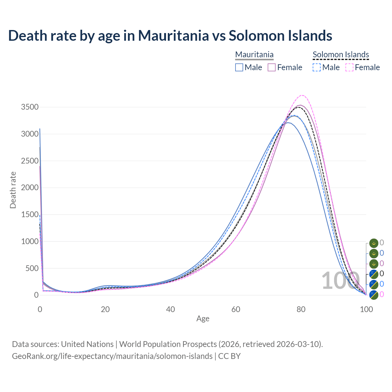 In Mauritania, the most common age of death is 78, compared to 79 in the Solomon Islands. The median age of death is 74.1 in Mauritania and 74.9 in the Solomon Islands, meaning only half of each cohort is expected to live past that age.