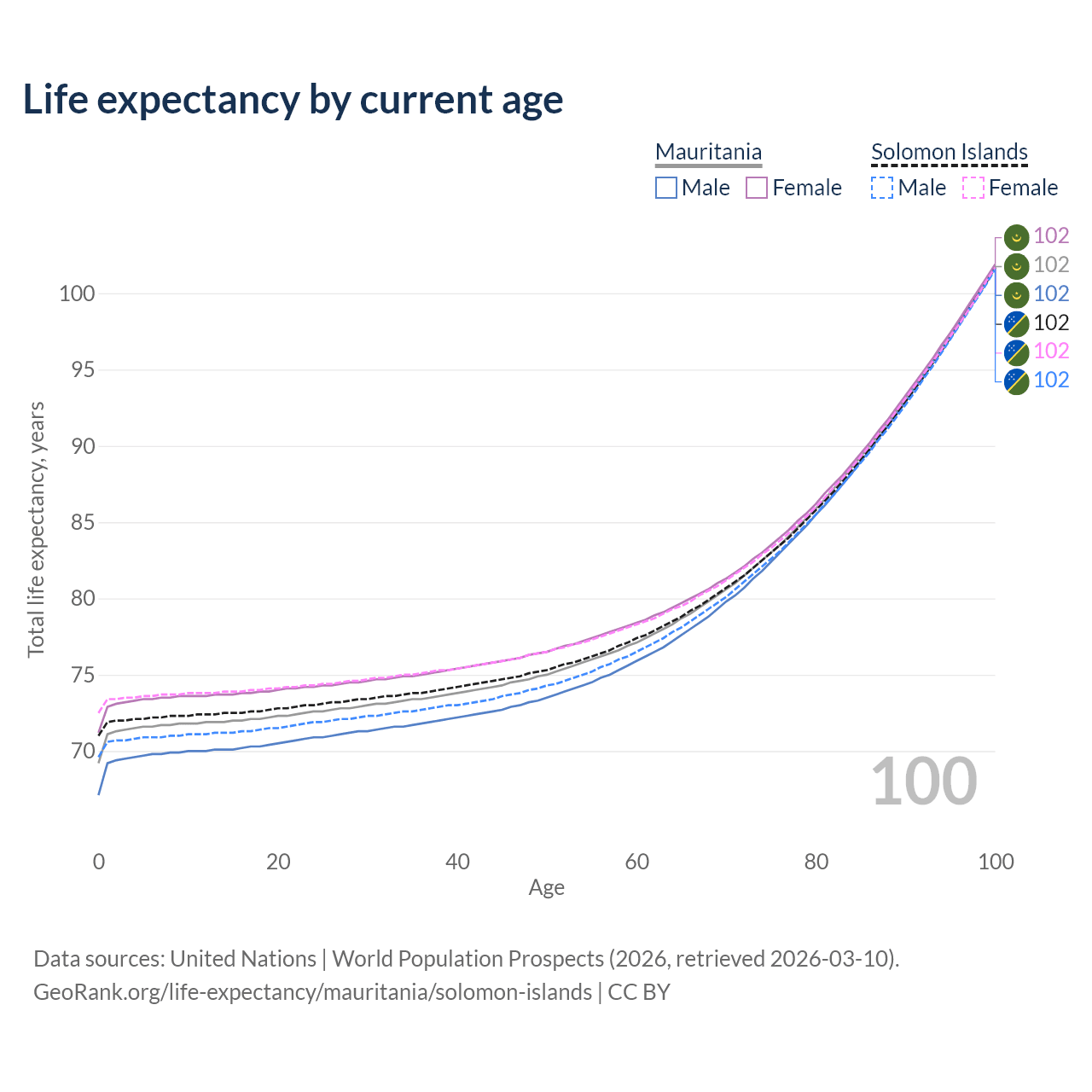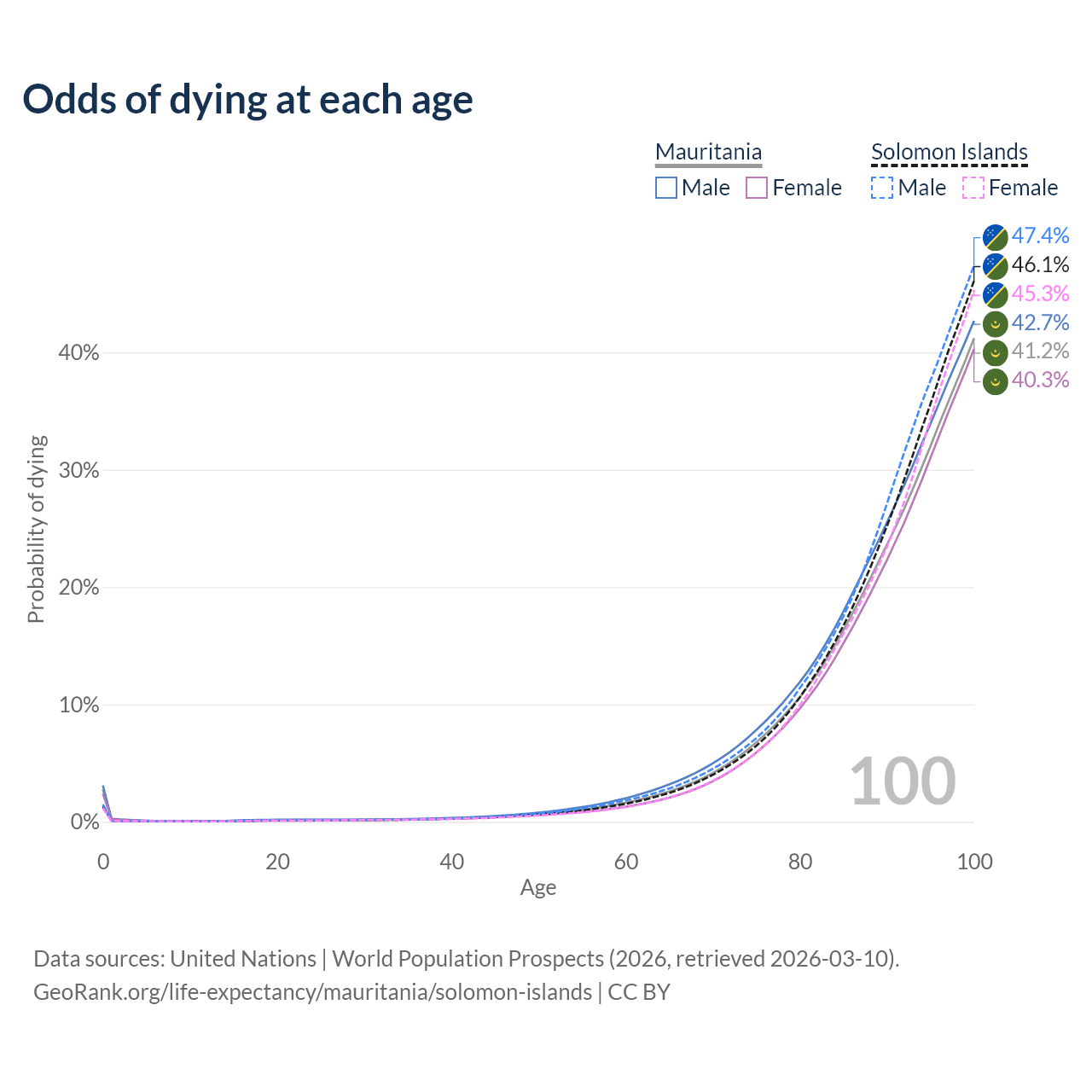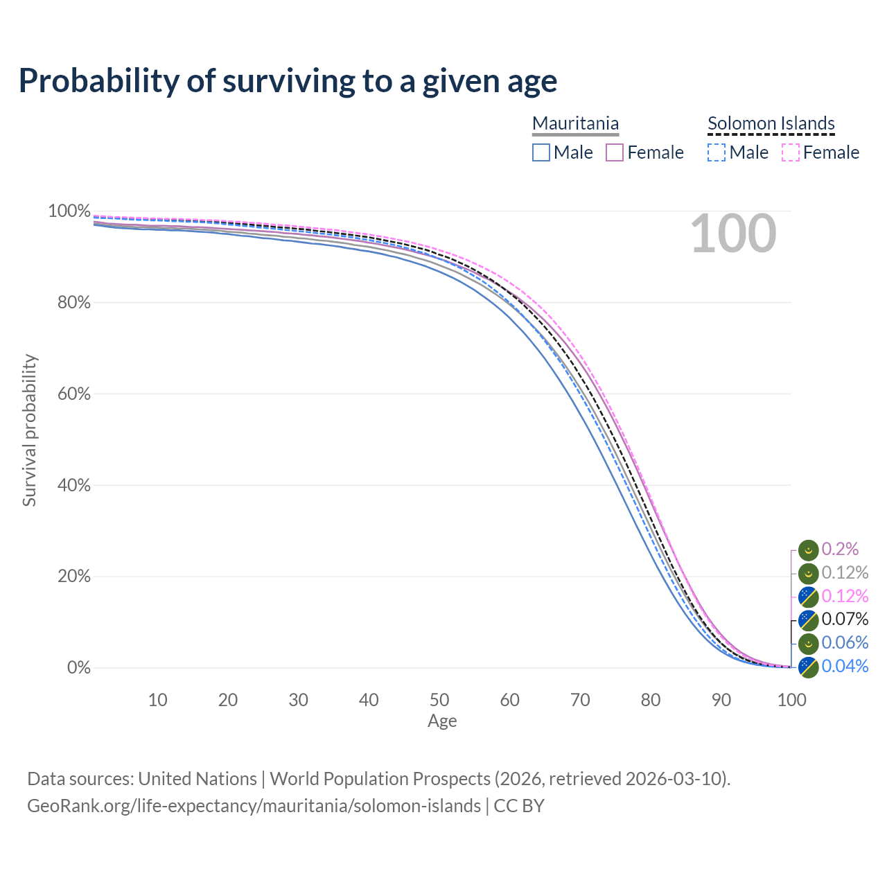 This life expectancy calculator shows the odds of living to 100, 95, 90, and below based on current age for both males and females in Mauritania and the Solomon Islands, along with mean and median age of death. The calculations are based on the 2026 life tables (actuarial tables) from the UN World Population Prospects.