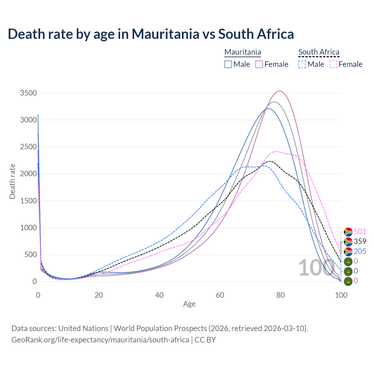 In Mauritania, the most common age of death is 78, compared to 77 in South Africa. The median age of death is 74.1 in Mauritania and 70.8 in South Africa, meaning only half of each cohort is expected to live past that age.