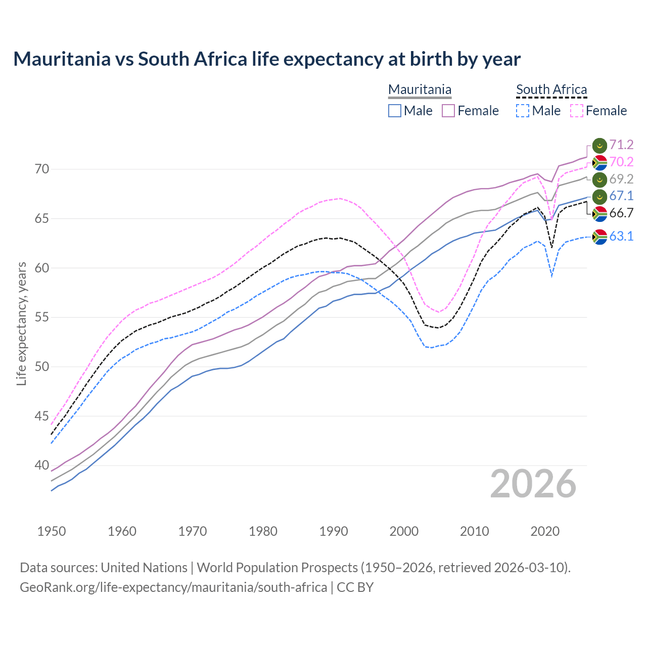 The average life expectancy at birth is 69.2 years in Mauritania vs 66.7 in South Africa. Mauritania is ranked 144/197 by life expectancy, and South Africa is 164/197. In Mauritania, the life expectancy is 67.1 years for males and 71.2 years for females. In South Africa, it's 63.1 years for males and 70.2 years for females.