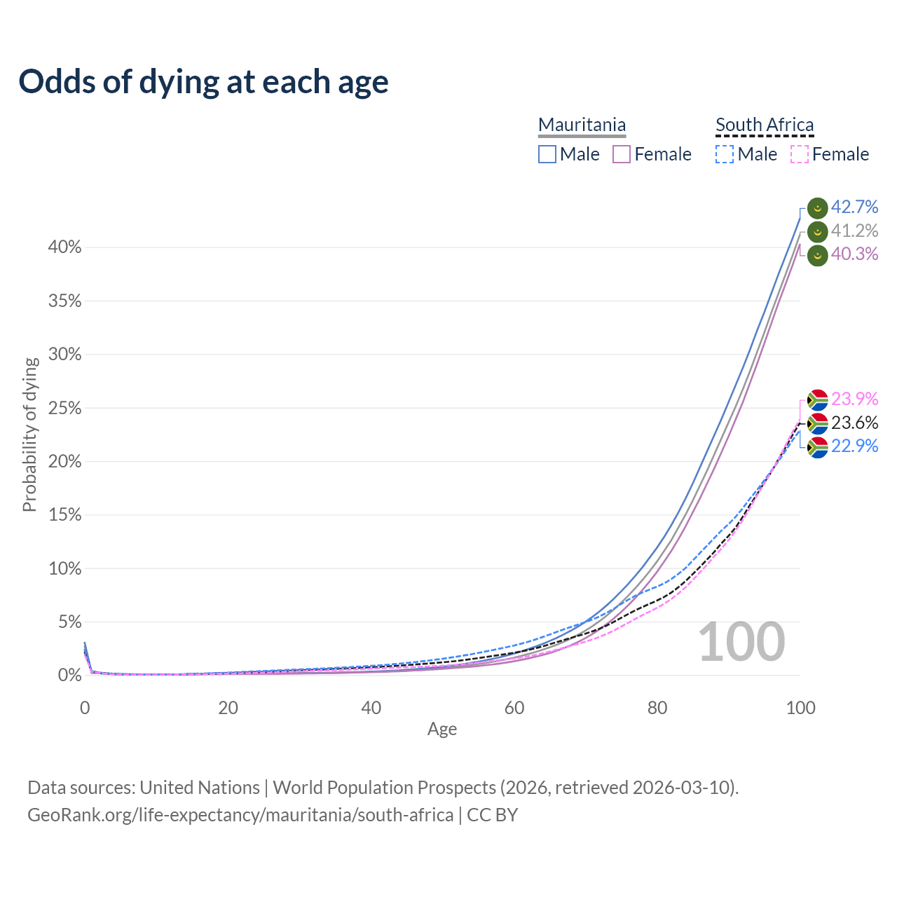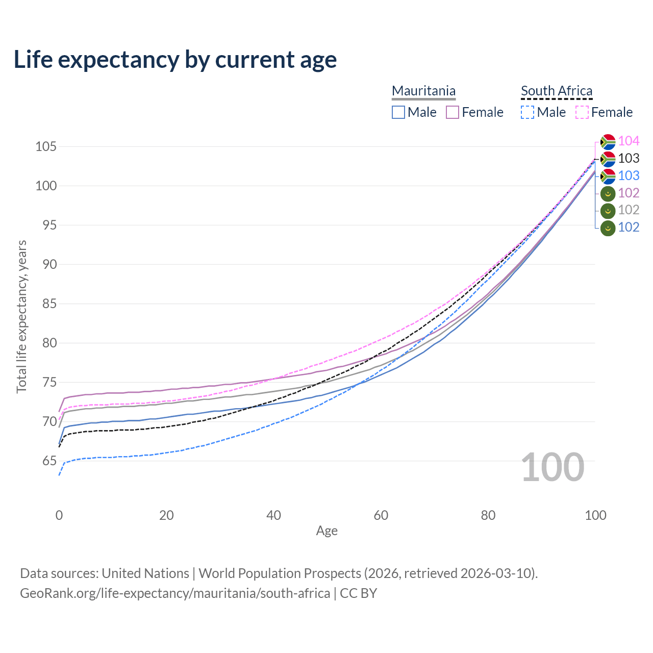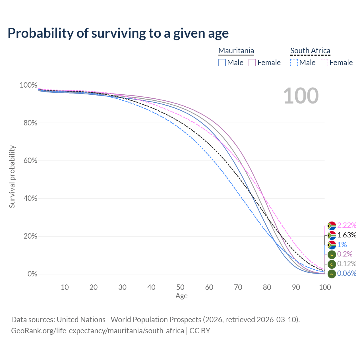 This life expectancy calculator shows the odds of living to 100, 95, 90, and below based on current age for both males and females in Mauritania and South Africa, along with mean and median age of death. The calculations are based on the 2026 life tables (actuarial tables) from the UN World Population Prospects.