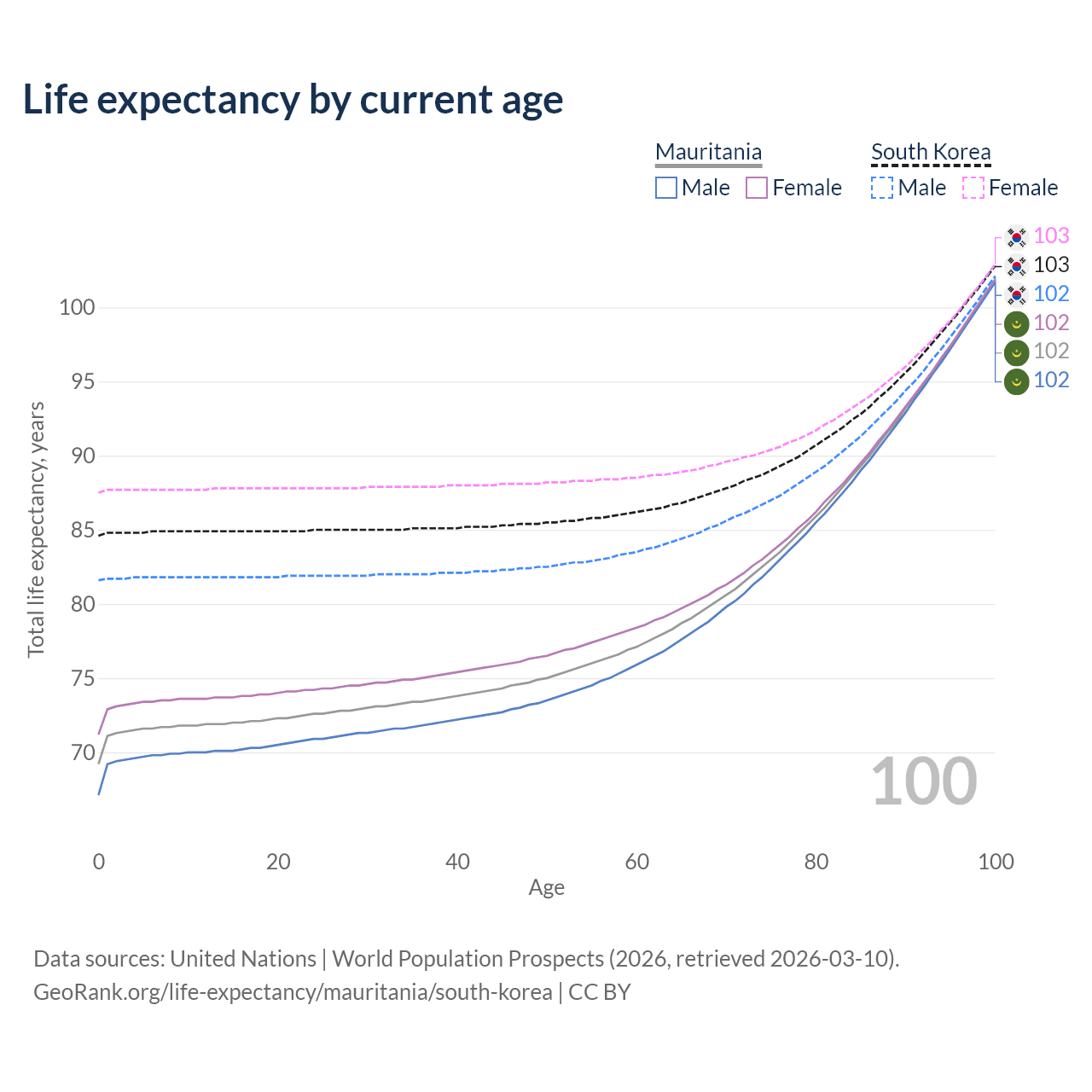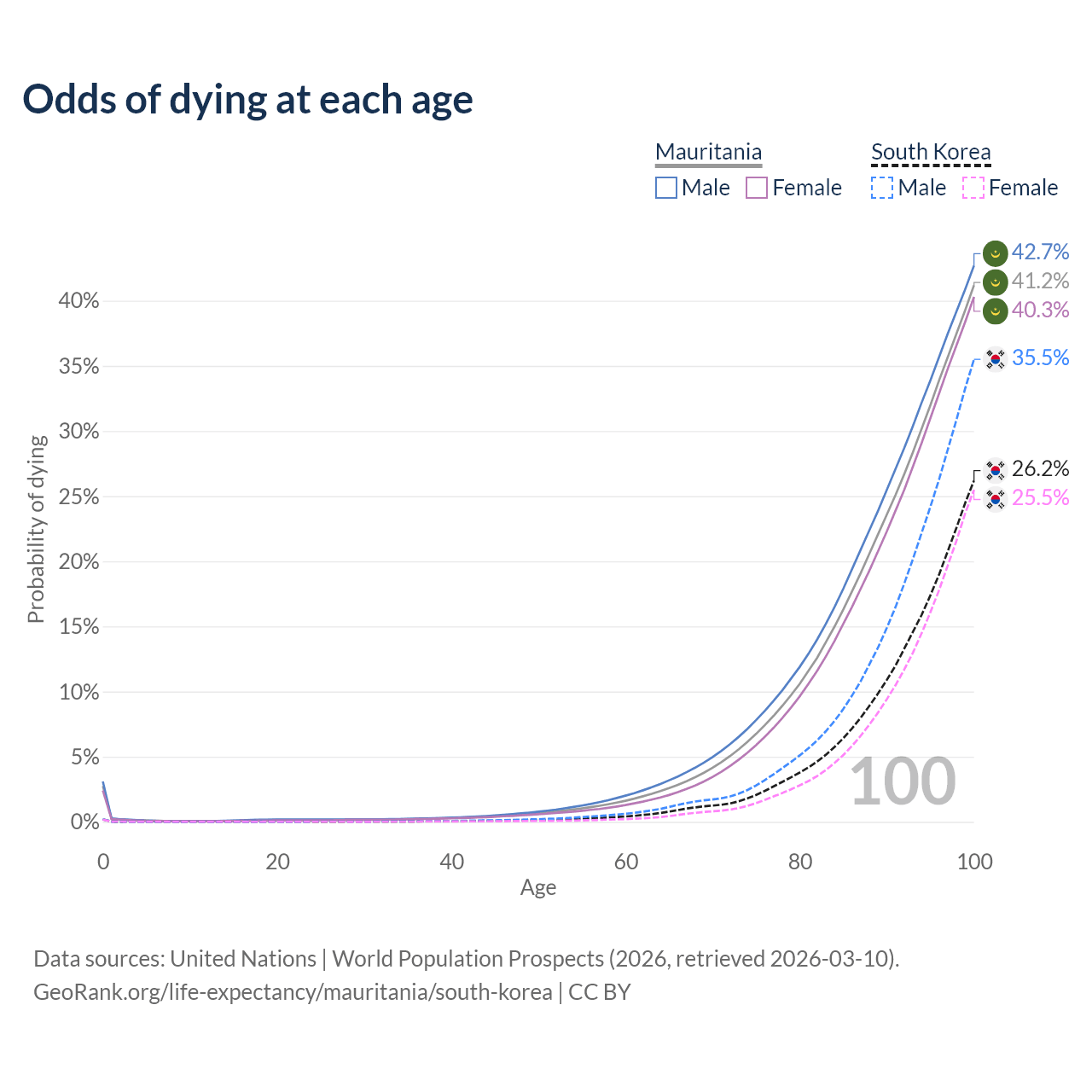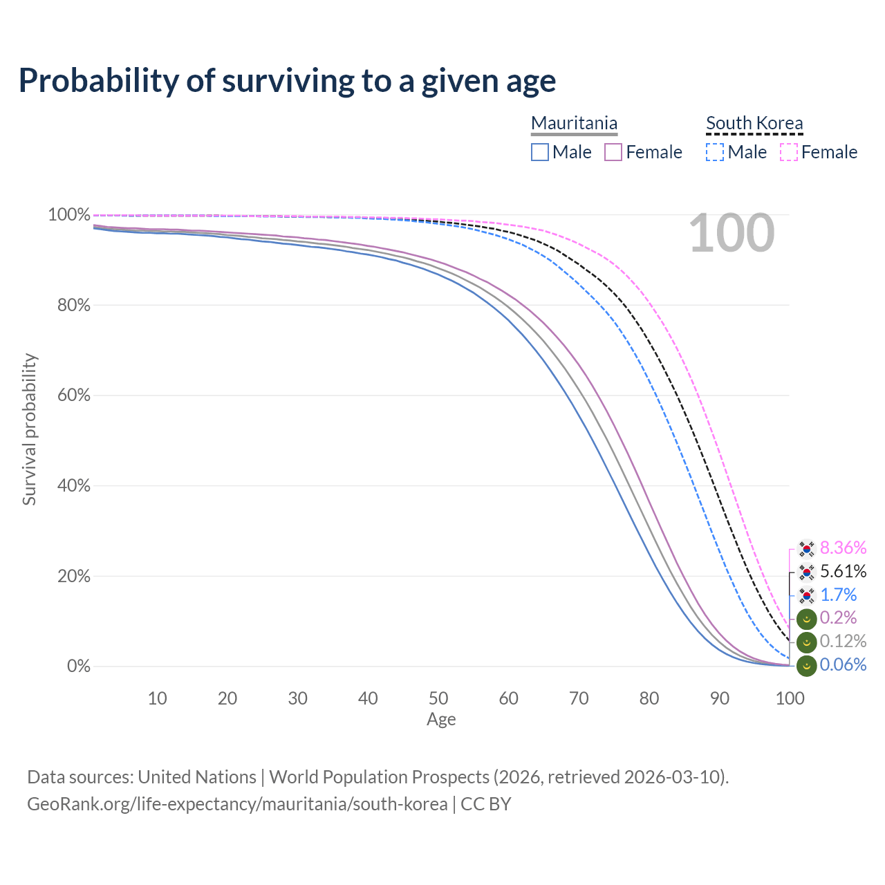 This life expectancy calculator shows the odds of living to 100, 95, 90, and below based on current age for both males and females in Mauritania and South Korea, along with mean and median age of death. The calculations are based on the 2026 life tables (actuarial tables) from the UN World Population Prospects.
