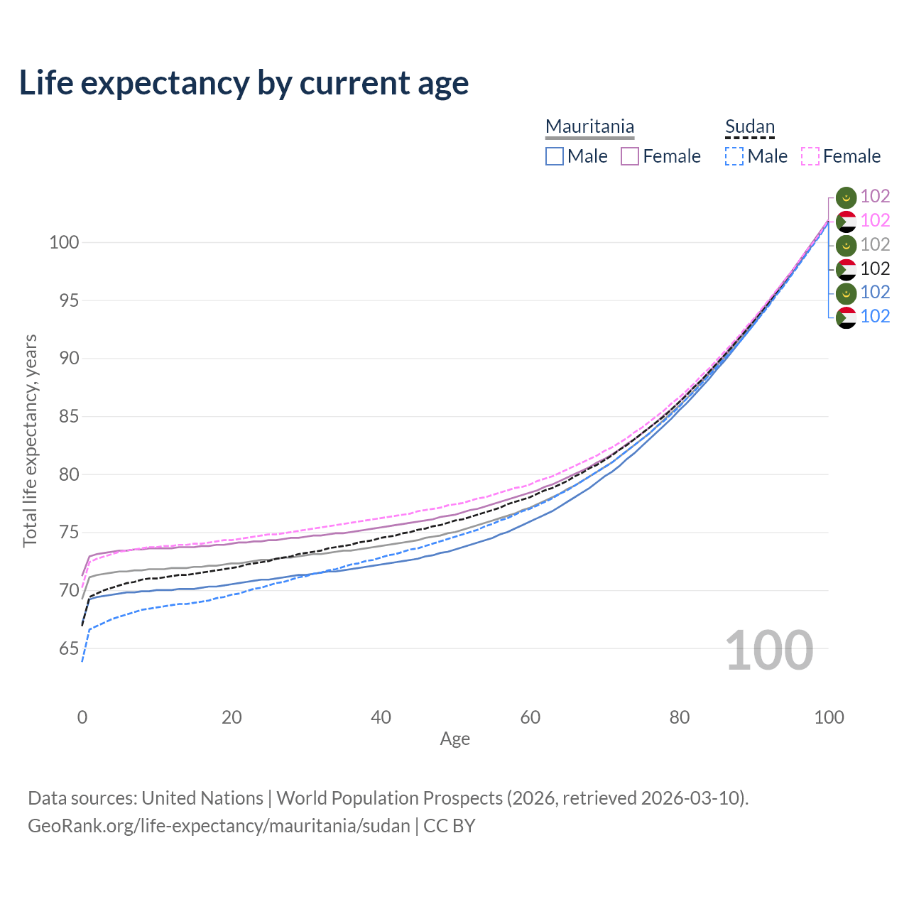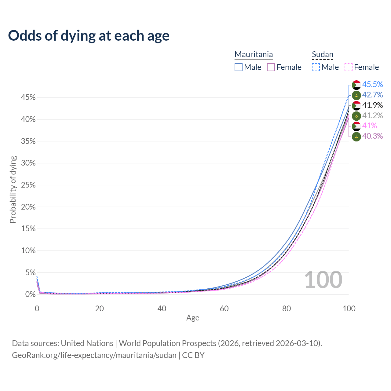 This life expectancy calculator shows the odds of living to 100, 95, 90, and below based on current age for both males and females in Mauritania and Sudan, along with mean and median age of death. The calculations are based on the 2026 life tables (actuarial tables) from the UN World Population Prospects.