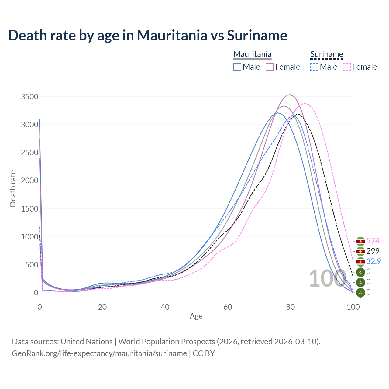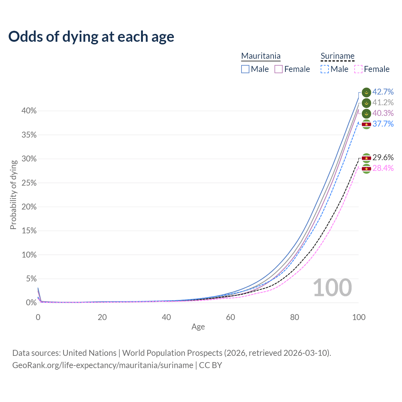 This life expectancy calculator shows the odds of living to 100, 95, 90, and below based on current age for both males and females in Mauritania and Suriname, along with mean and median age of death. The calculations are based on the 2026 life tables (actuarial tables) from the UN World Population Prospects.
