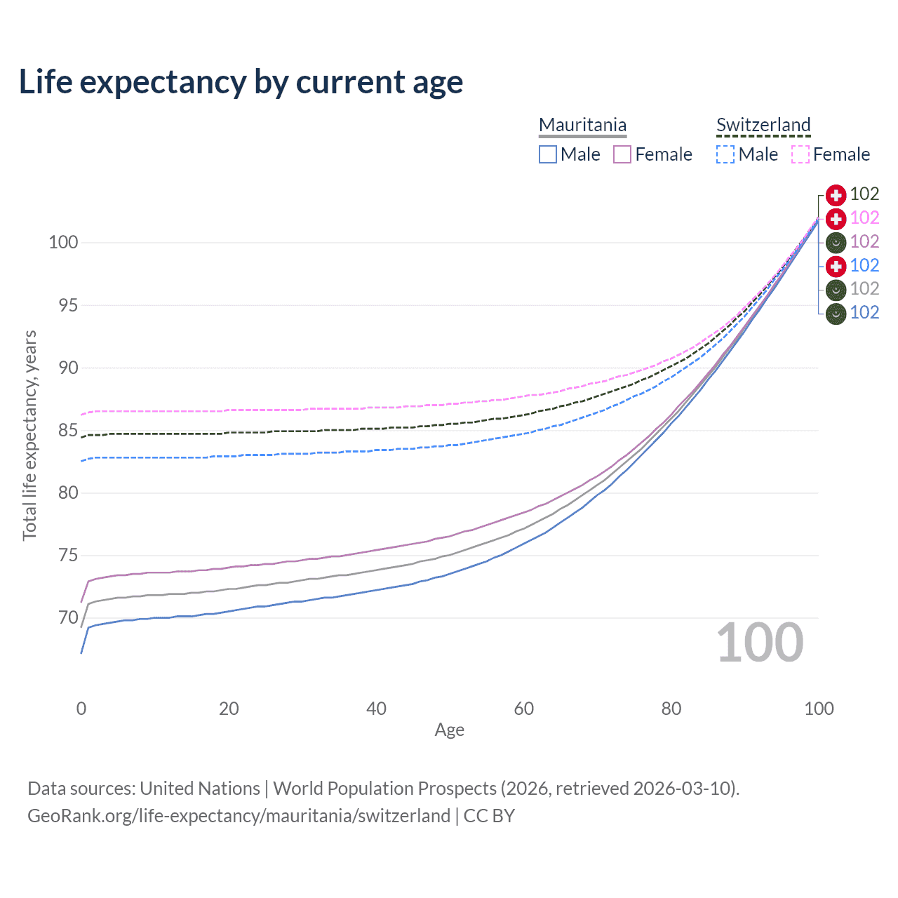 This life expectancy calculator shows the odds of living to 100, 95, 90, and below based on current age for both males and females in Mauritania and Switzerland, along with mean and median age of death. The calculations are based on the 2026 life tables (actuarial tables) from the UN World Population Prospects.