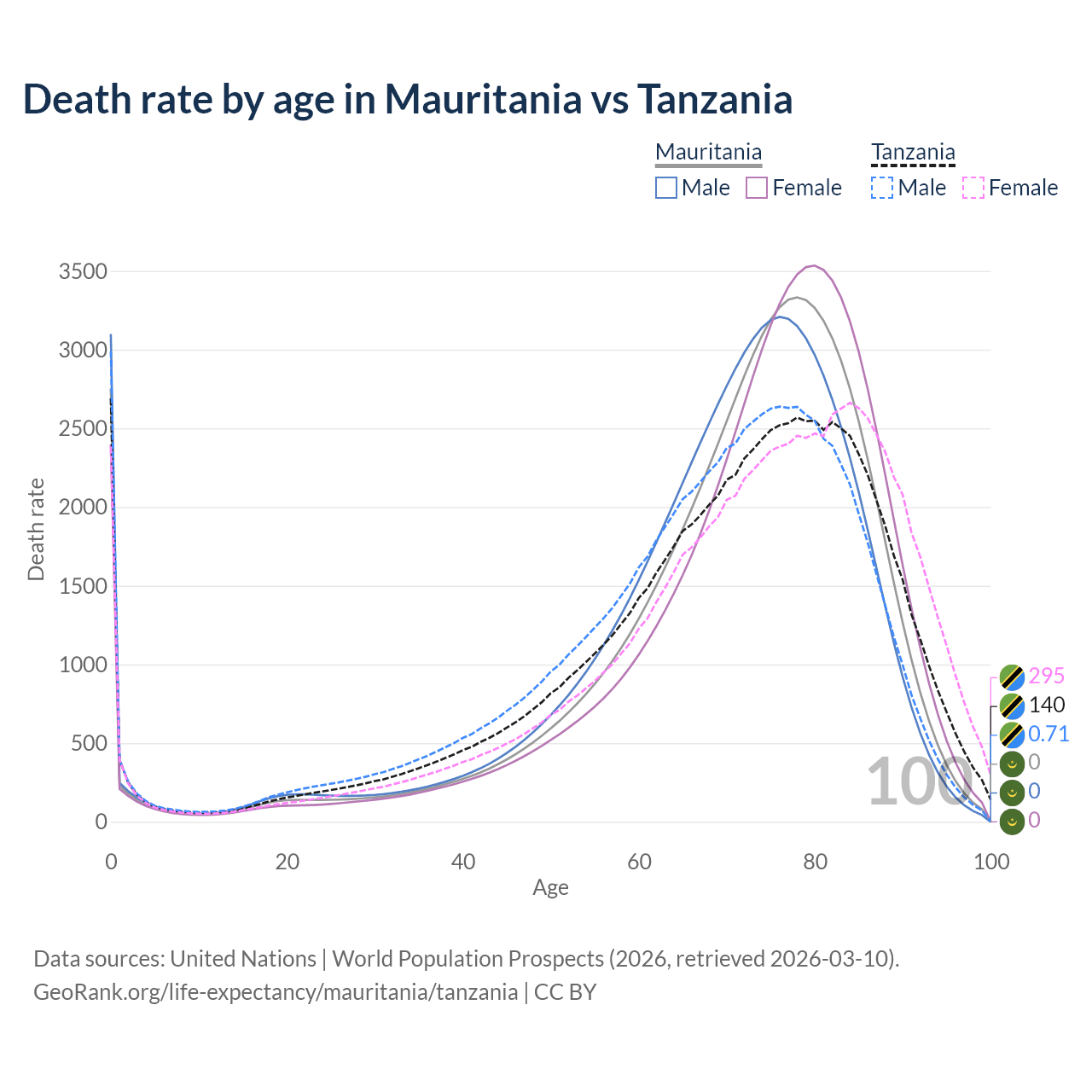 In Mauritania, the most common age of death is 78, compared to 0 in Tanzania. The median age of death is 74.1 in Mauritania and 72.6 in Tanzania, meaning only half of each cohort is expected to live past that age.