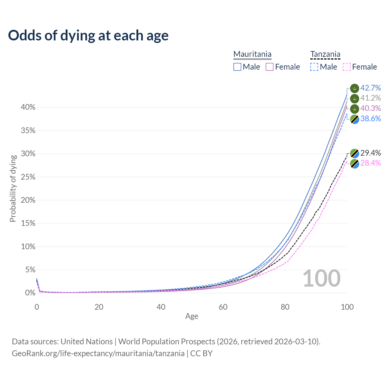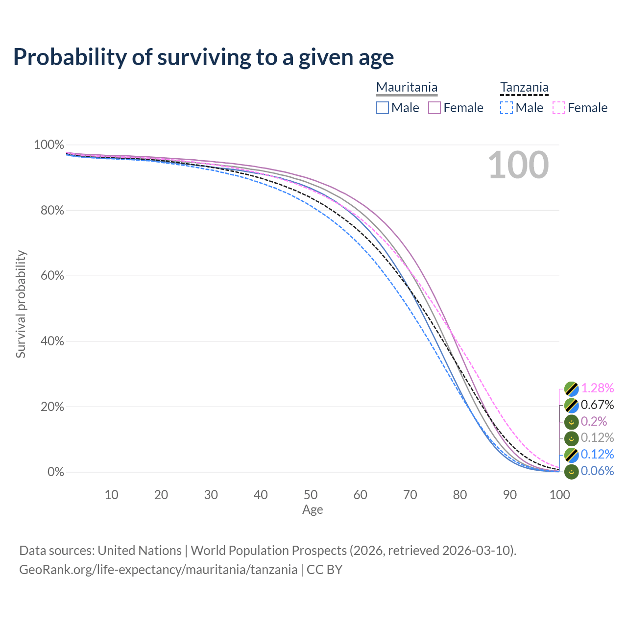 This life expectancy calculator shows the odds of living to 100, 95, 90, and below based on current age for both males and females in Mauritania and Tanzania, along with mean and median age of death. The calculations are based on the 2026 life tables (actuarial tables) from the UN World Population Prospects.