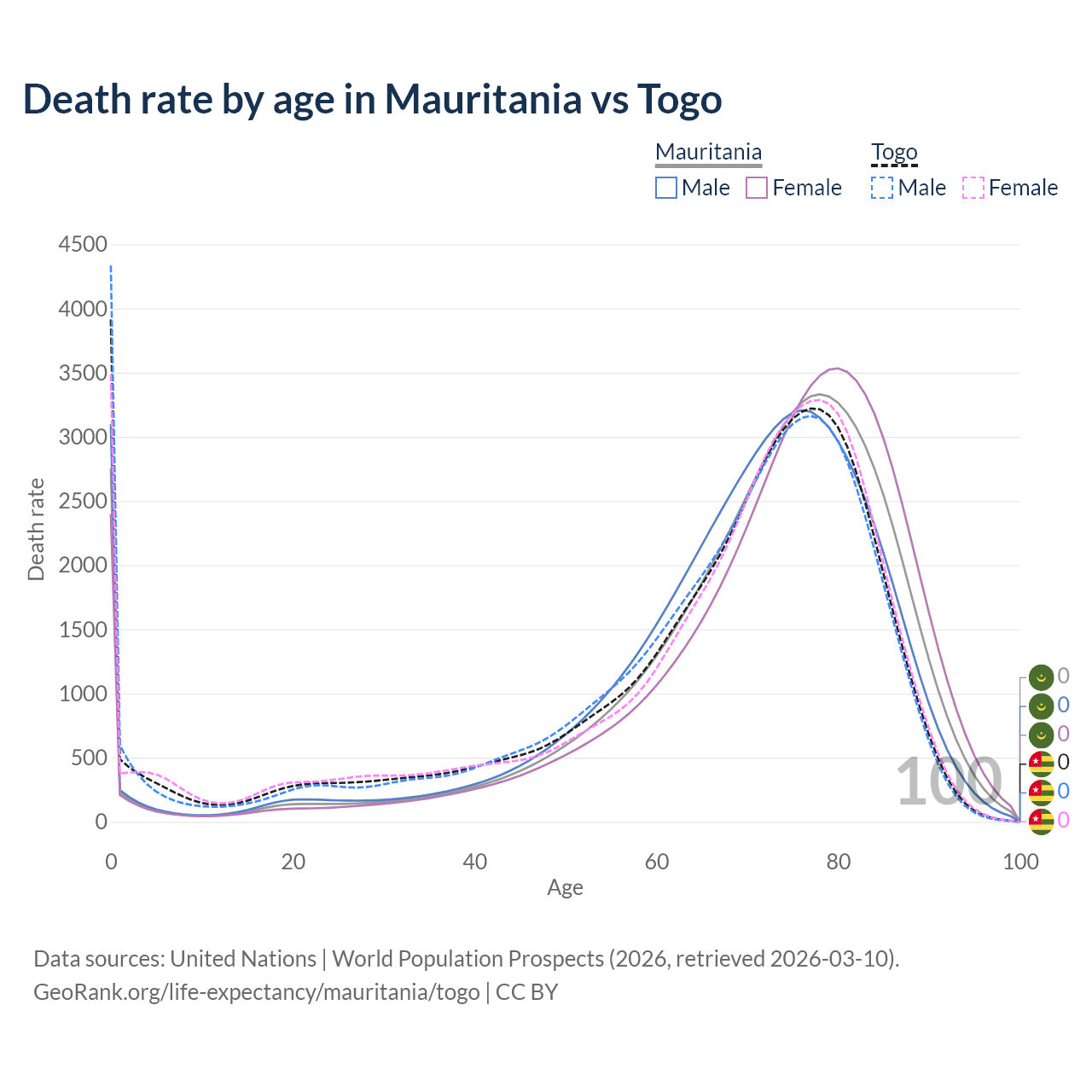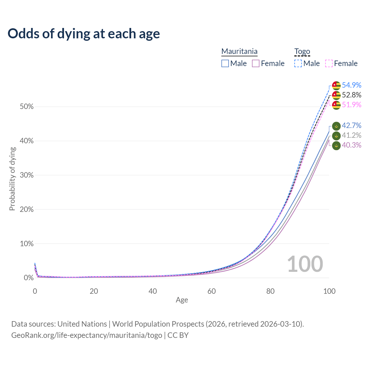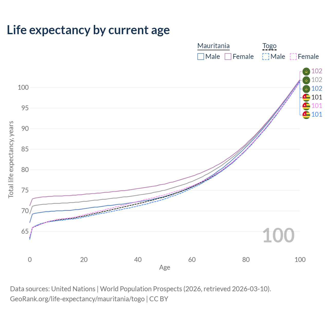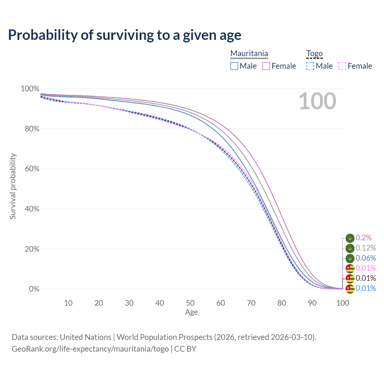 This life expectancy calculator shows the odds of living to 100, 95, 90, and below based on current age for both males and females in Mauritania and Togo, along with mean and median age of death. The calculations are based on the 2026 life tables (actuarial tables) from the UN World Population Prospects.