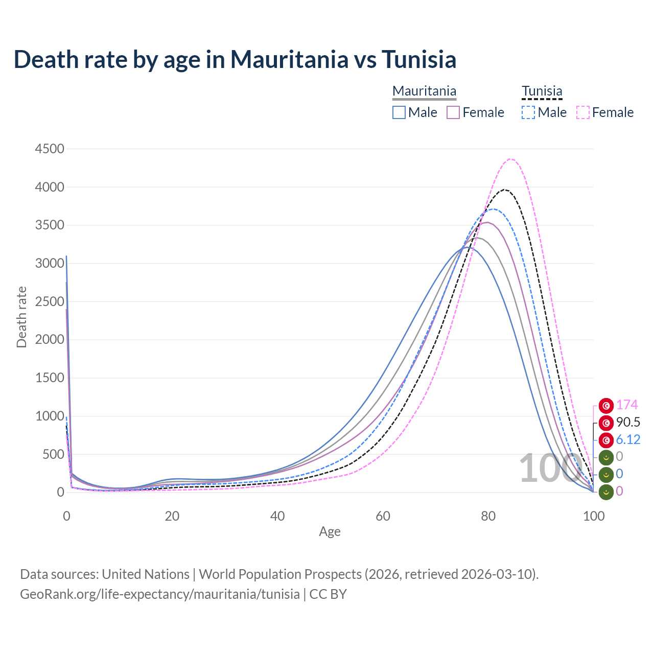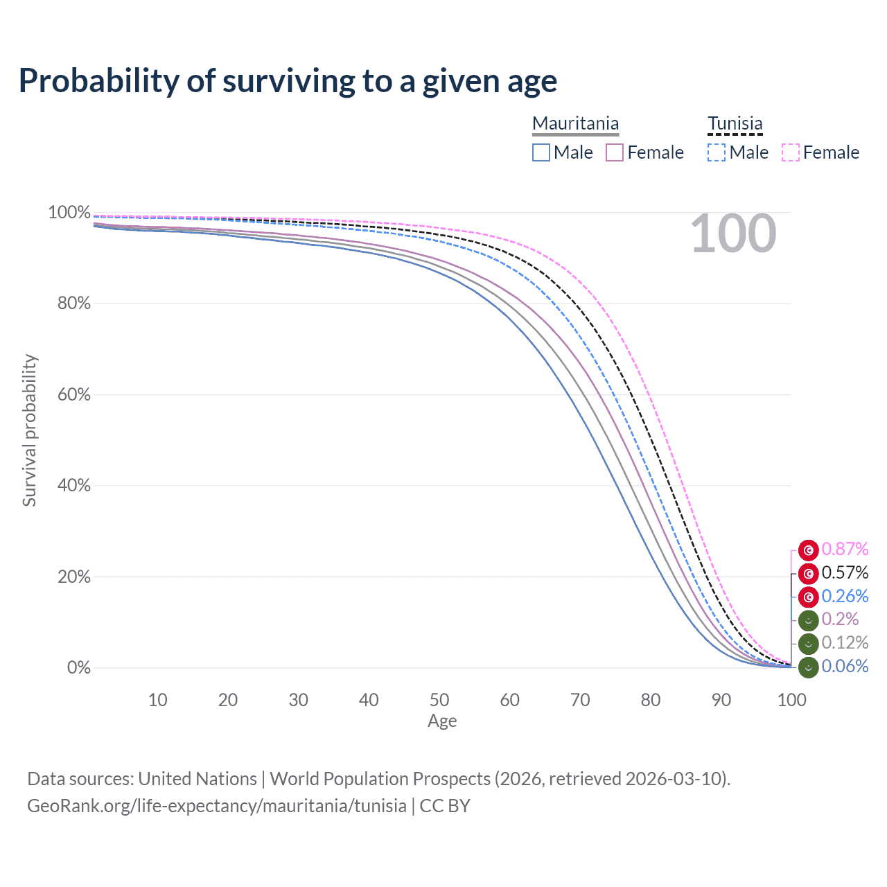 This life expectancy calculator shows the odds of living to 100, 95, 90, and below based on current age for both males and females in Mauritania and Tunisia, along with mean and median age of death. The calculations are based on the 2026 life tables (actuarial tables) from the UN World Population Prospects.