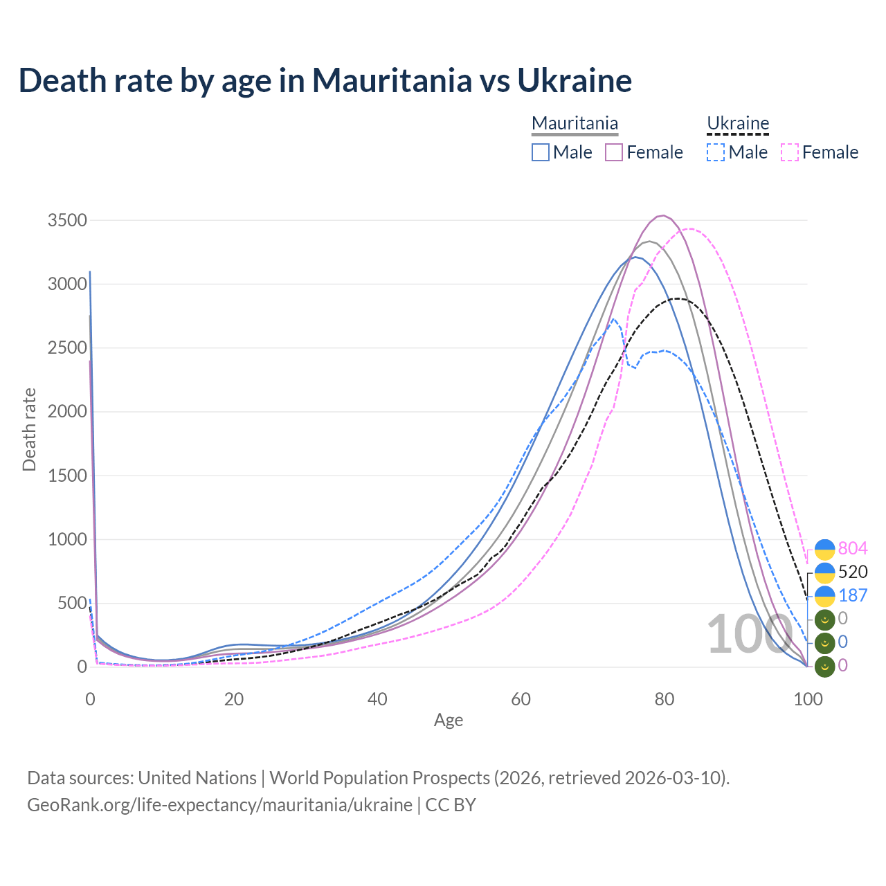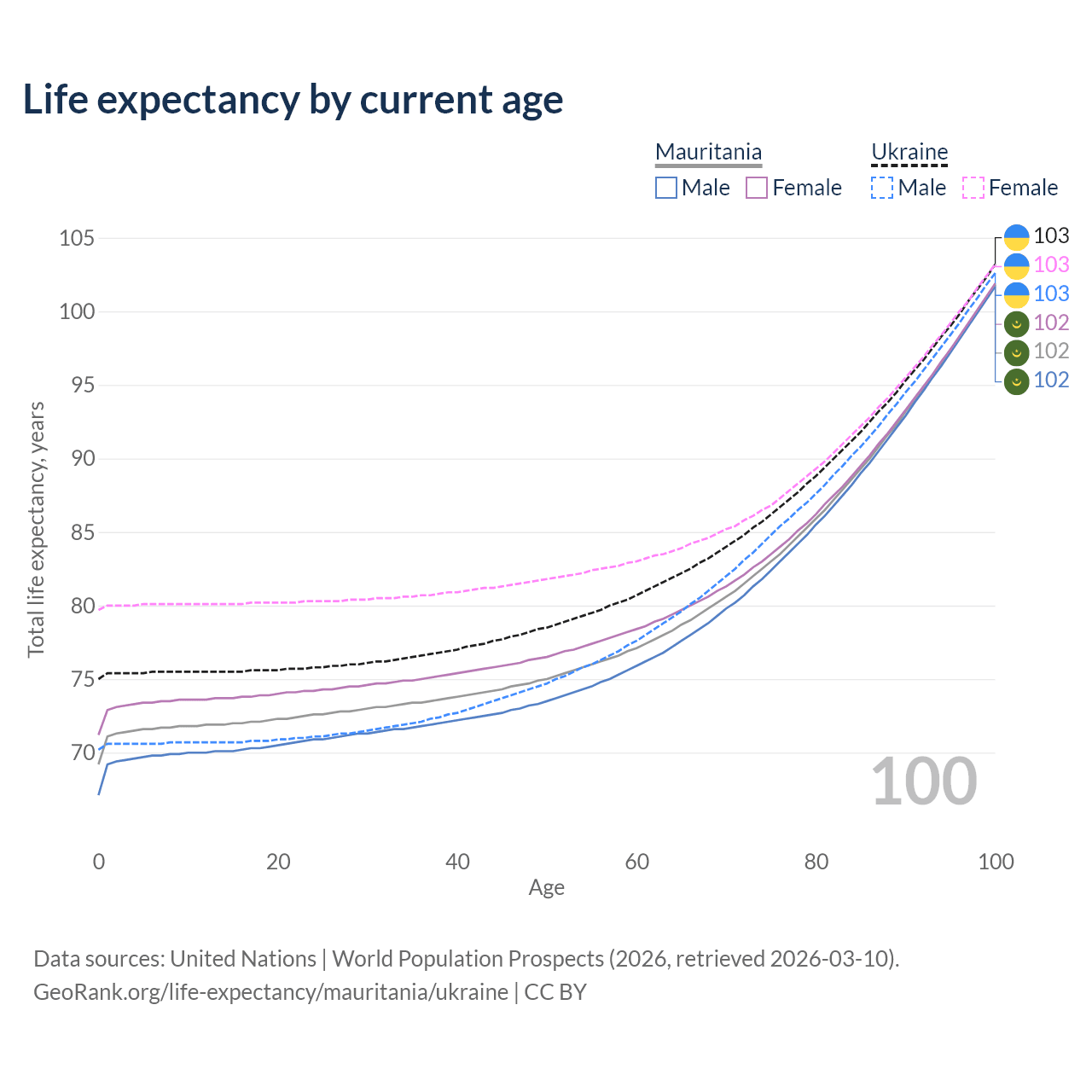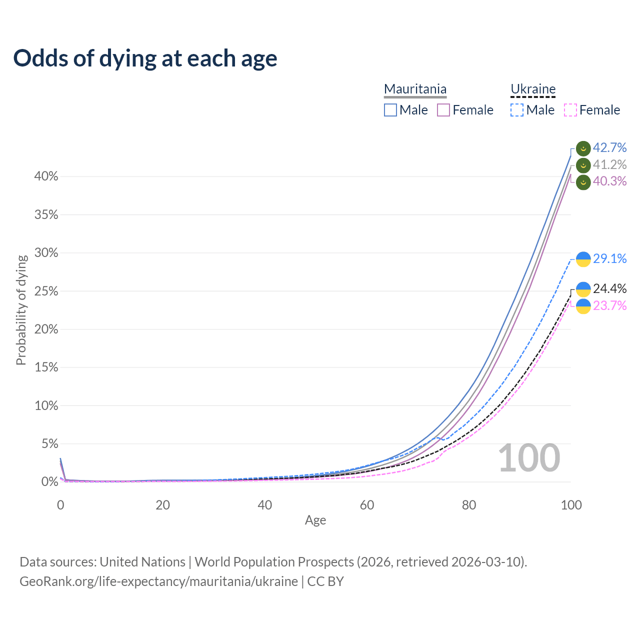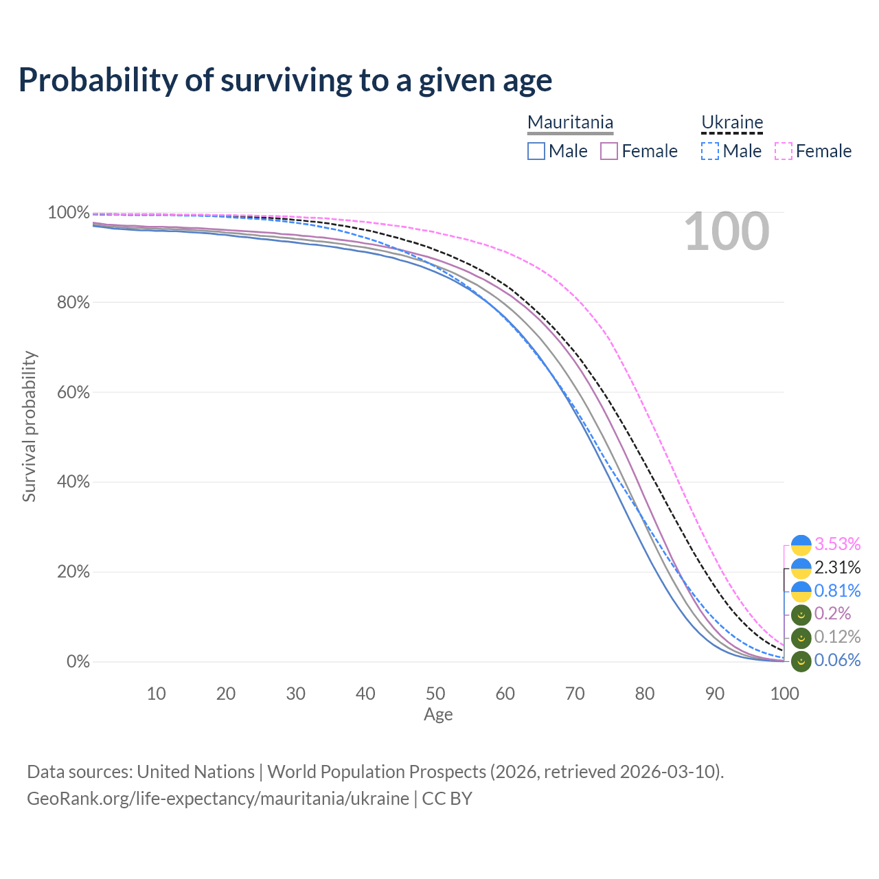 This life expectancy calculator shows the odds of living to 100, 95, 90, and below based on current age for both males and females in Mauritania and Ukraine, along with mean and median age of death. The calculations are based on the 2026 life tables (actuarial tables) from the UN World Population Prospects.