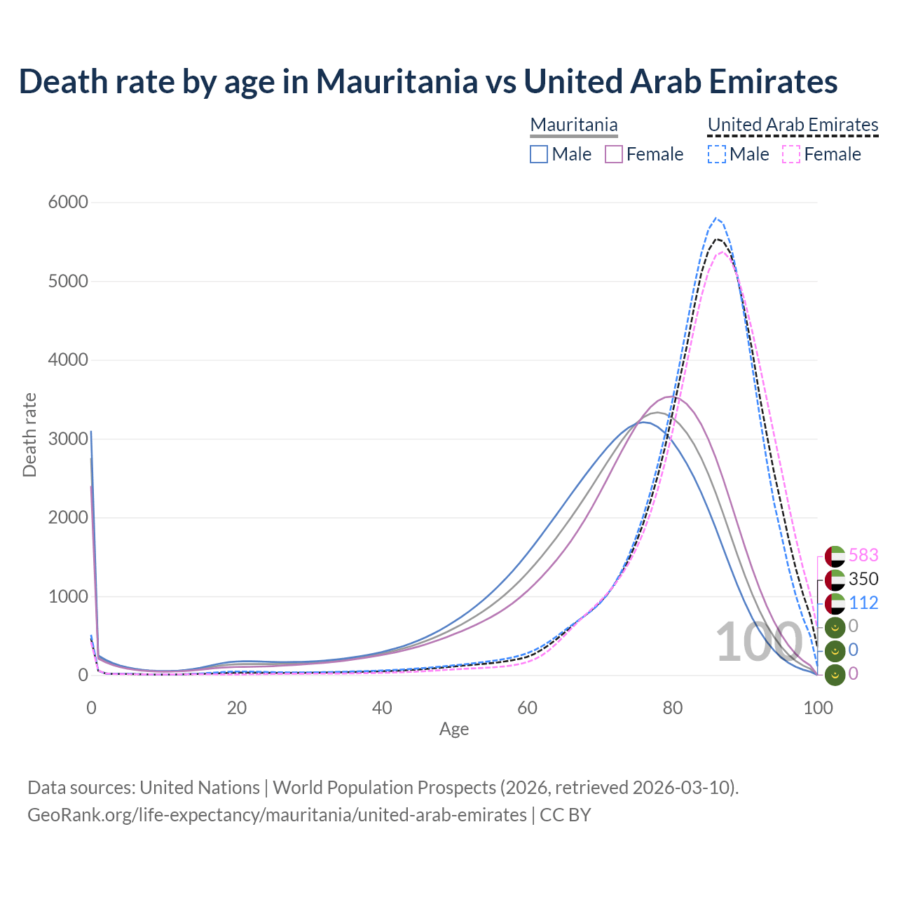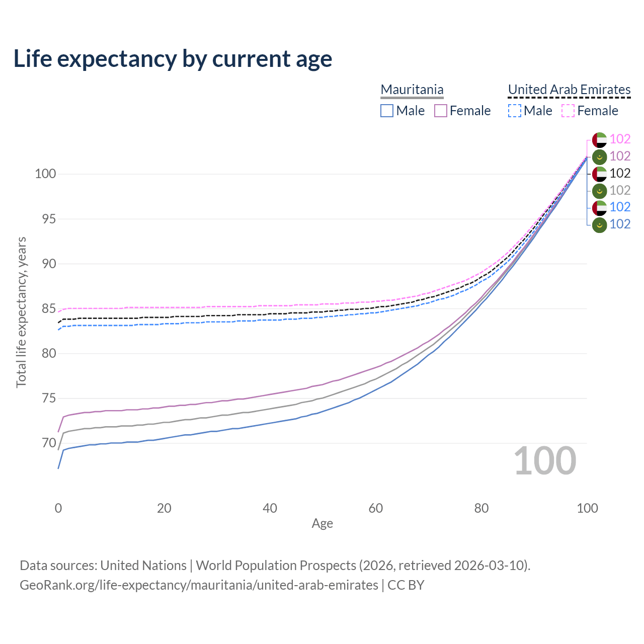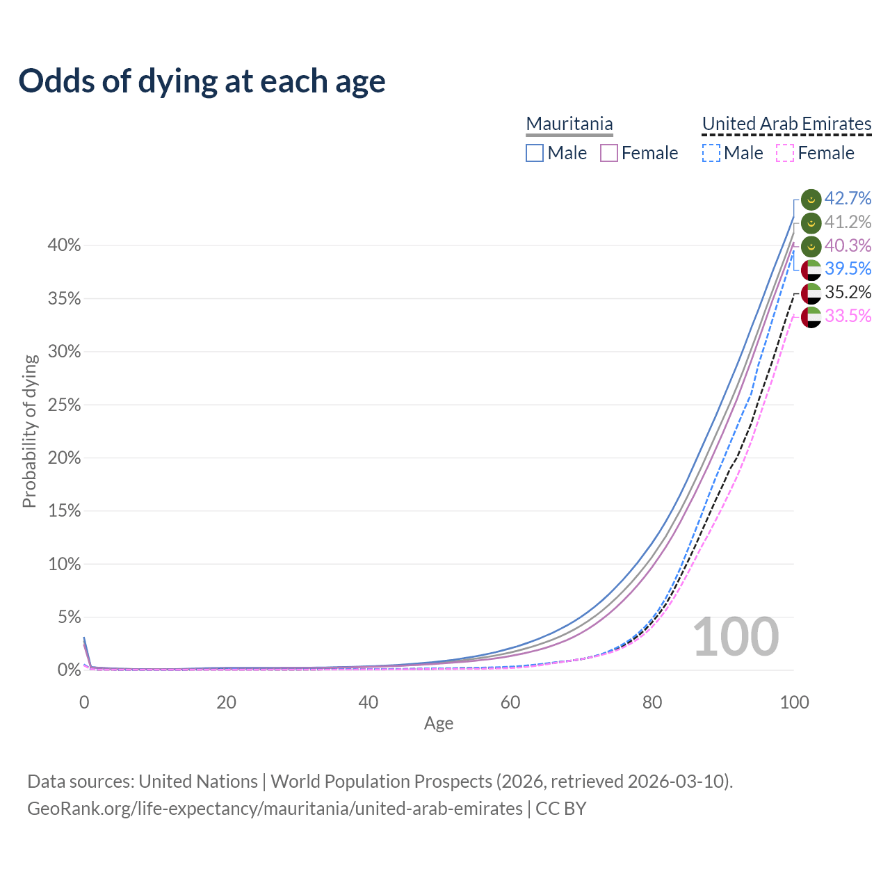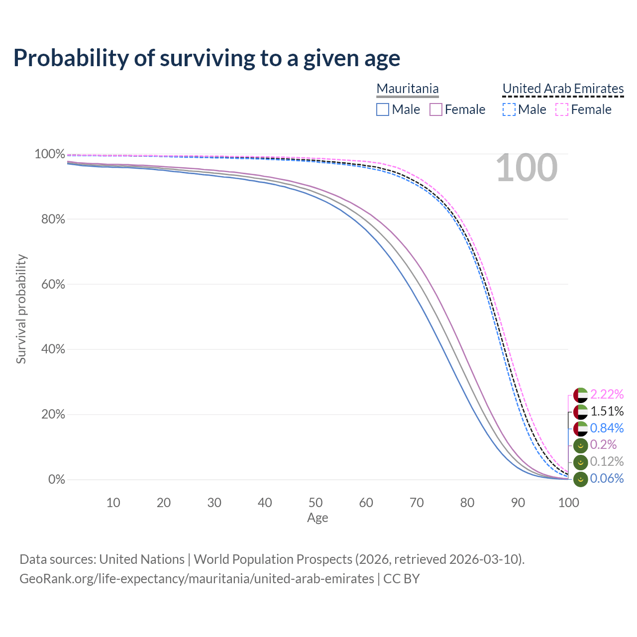 This life expectancy calculator shows the odds of living to 100, 95, 90, and below based on current age for both males and females in Mauritania and the United Arab Emirates, along with mean and median age of death. The calculations are based on the 2026 life tables (actuarial tables) from the UN World Population Prospects.