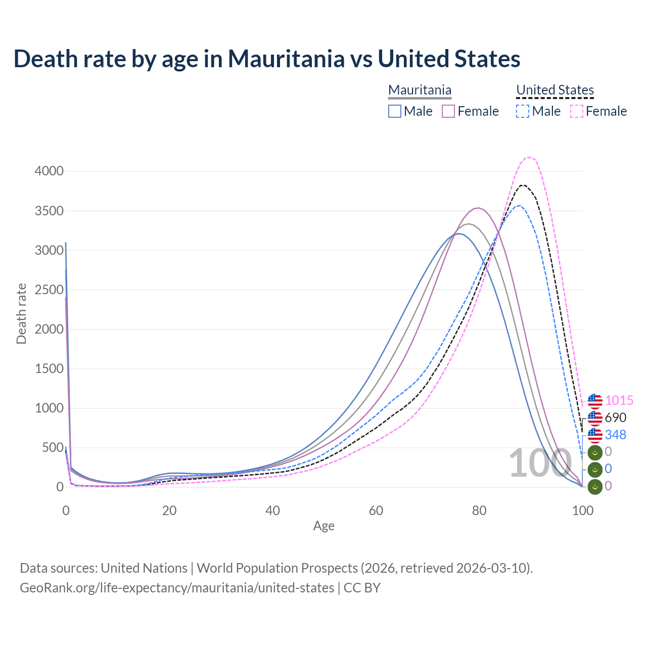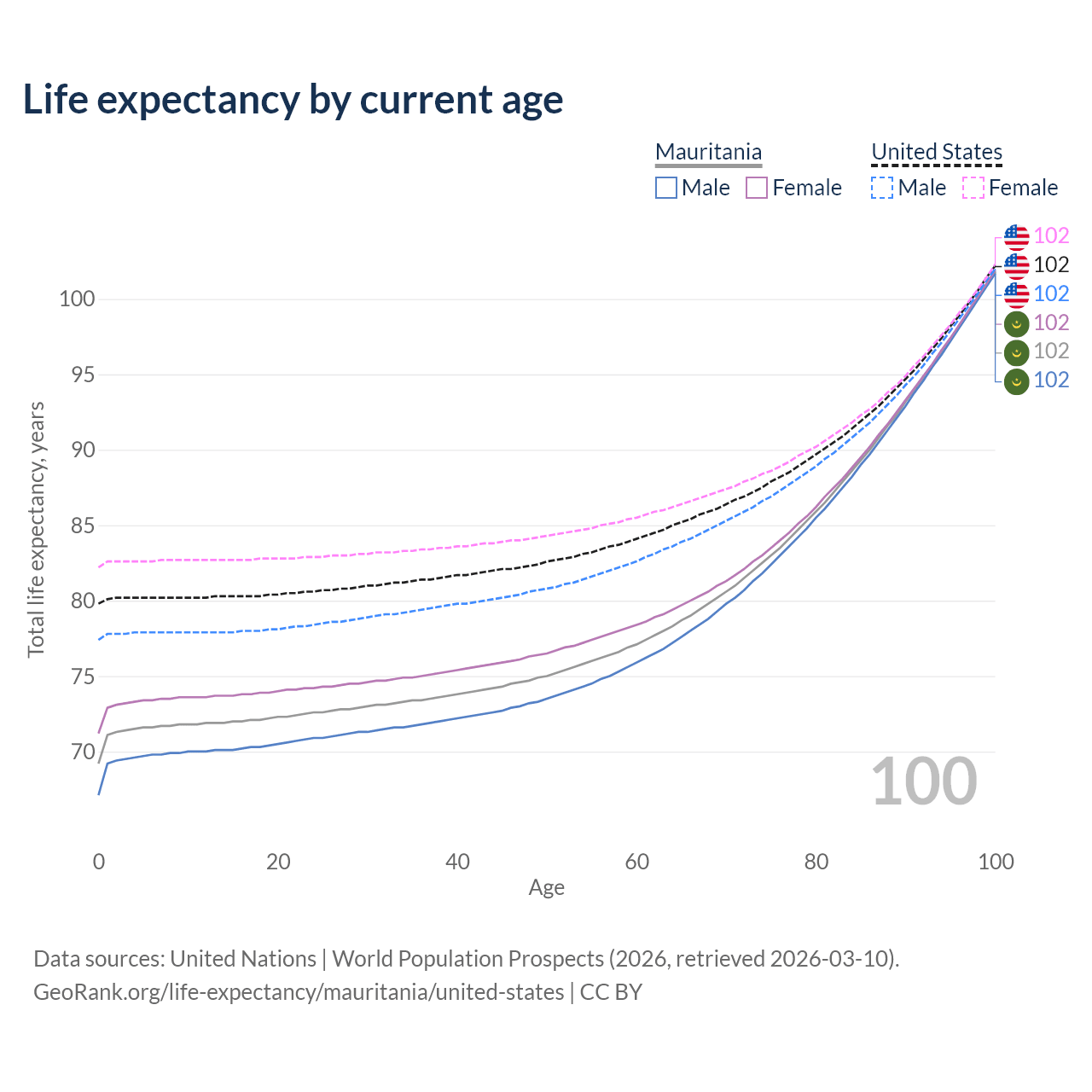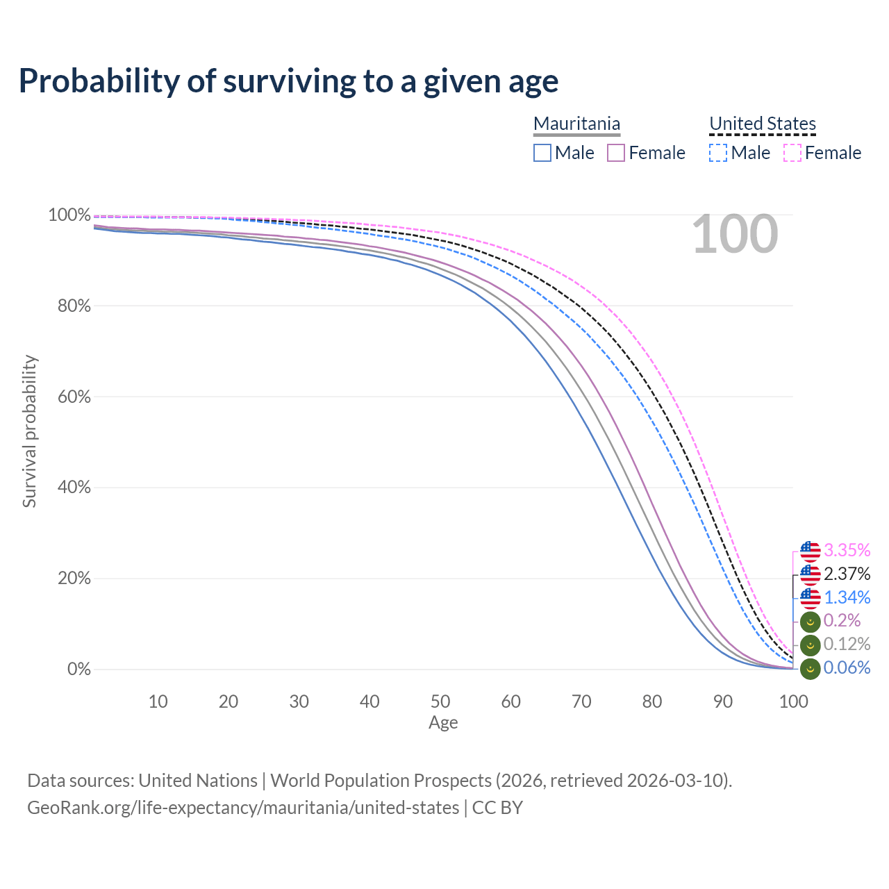 This life expectancy calculator shows the odds of living to 100, 95, 90, and below based on current age for both males and females in Mauritania and the United States, along with mean and median age of death. The calculations are based on the 2026 life tables (actuarial tables) from the UN World Population Prospects.