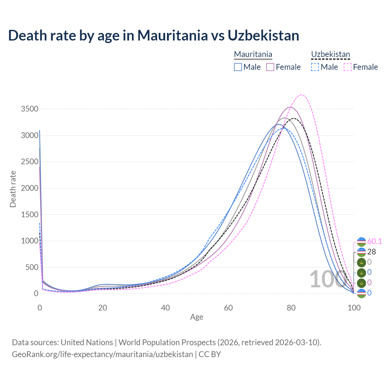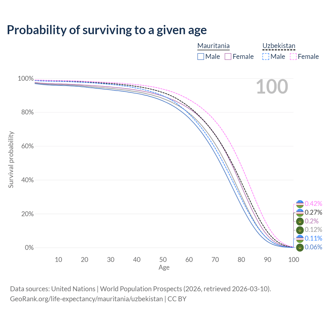 This life expectancy calculator shows the odds of living to 100, 95, 90, and below based on current age for both males and females in Mauritania and Uzbekistan, along with mean and median age of death. The calculations are based on the 2026 life tables (actuarial tables) from the UN World Population Prospects.