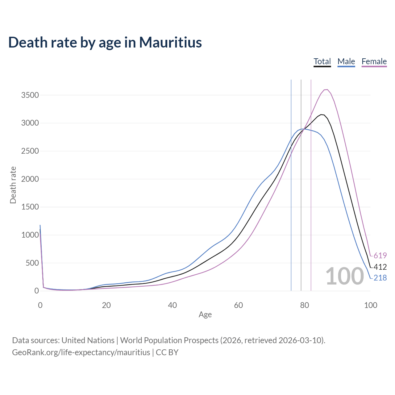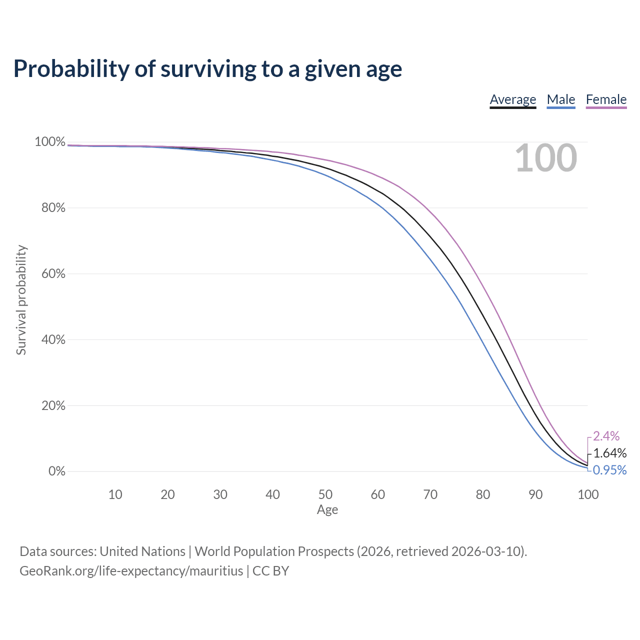 This life expectancy calculator shows the odds of living to 100, 95, 90, and below based on current age for both males and females in Mauritius, along with mean and median age of death. The calculations are based on the 2026 life tables (actuarial tables) from the UN World Population Prospects.