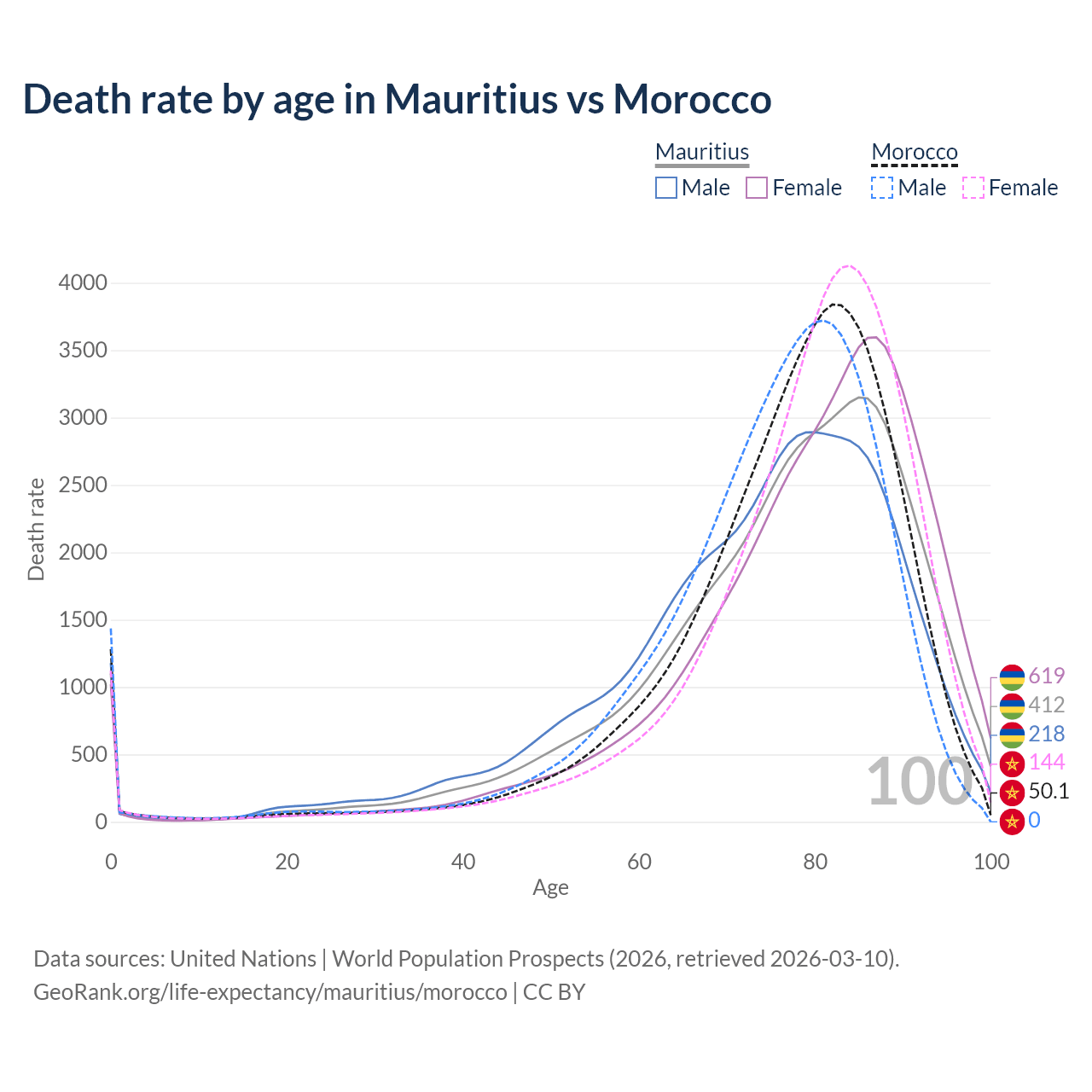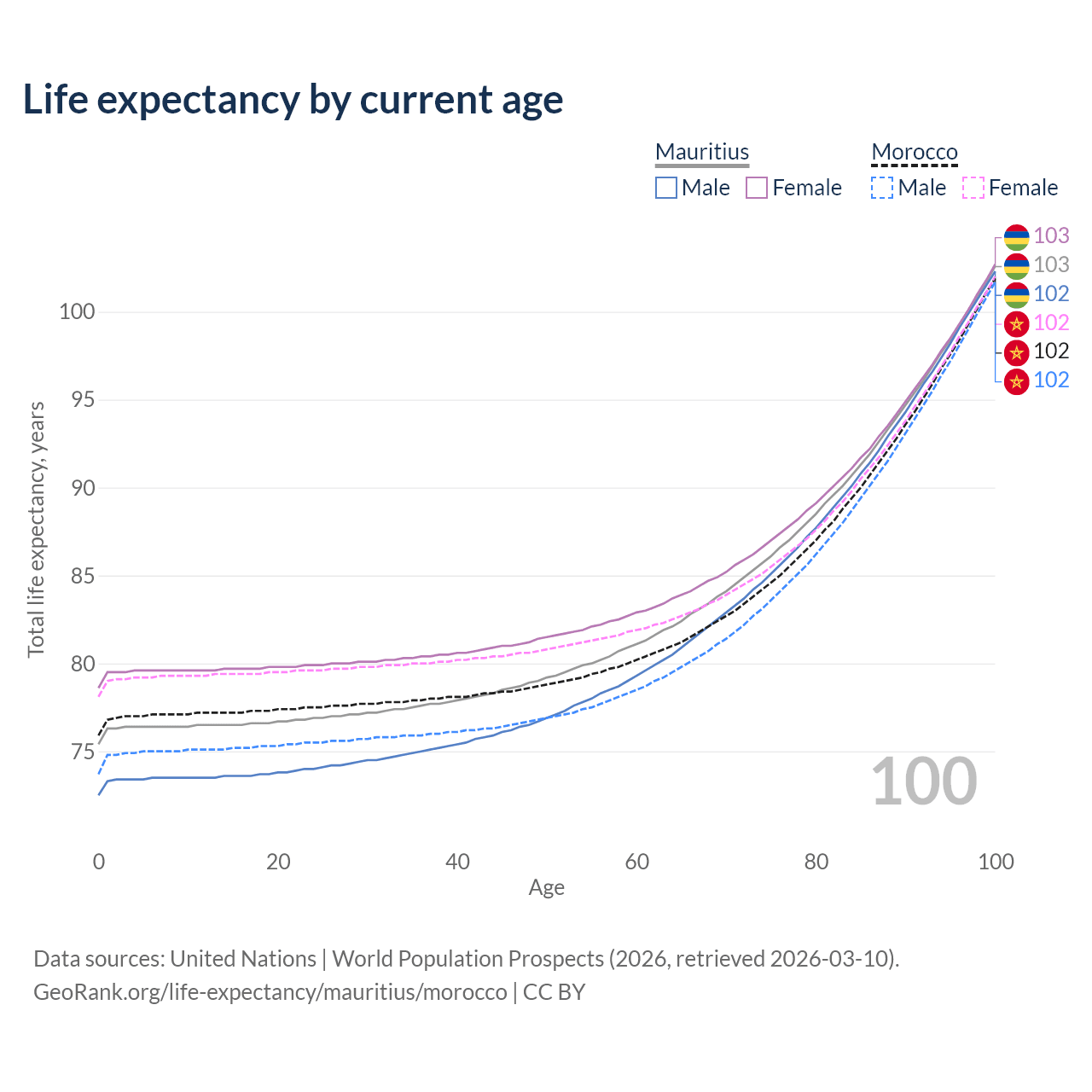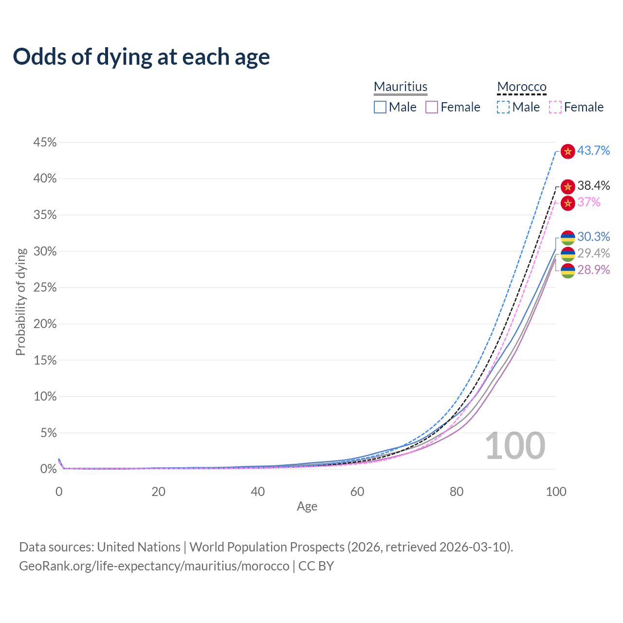 This life expectancy calculator shows the odds of living to 100, 95, 90, and below based on current age for both males and females in Mauritius and Morocco, along with mean and median age of death. The calculations are based on the 2026 life tables (actuarial tables) from the UN World Population Prospects.