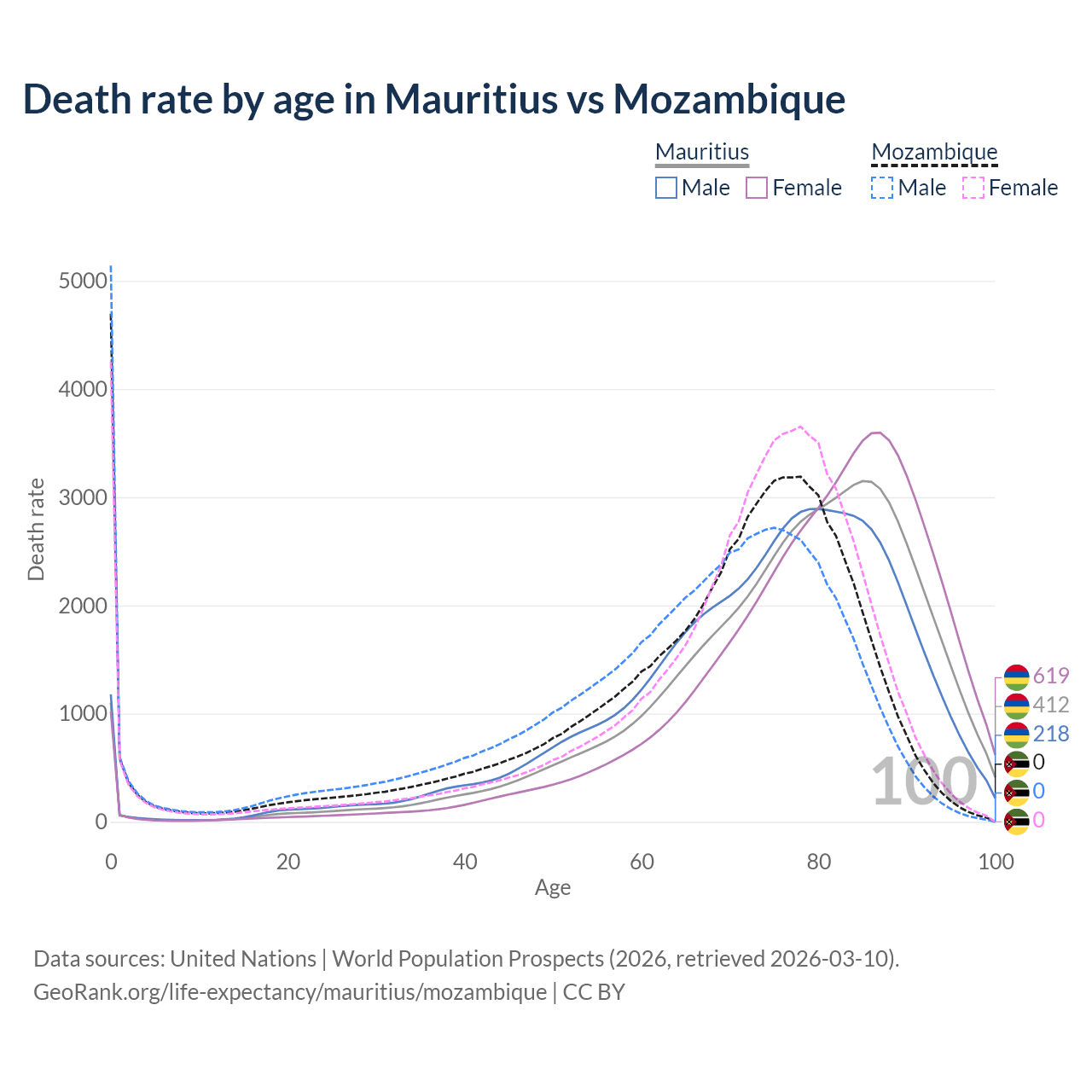 In Mauritius, the most common age of death is 85, compared to 0 in Mozambique. The median age of death is 79.1 in Mauritius and 71.2 in Mozambique, meaning only half of each cohort is expected to live past that age.