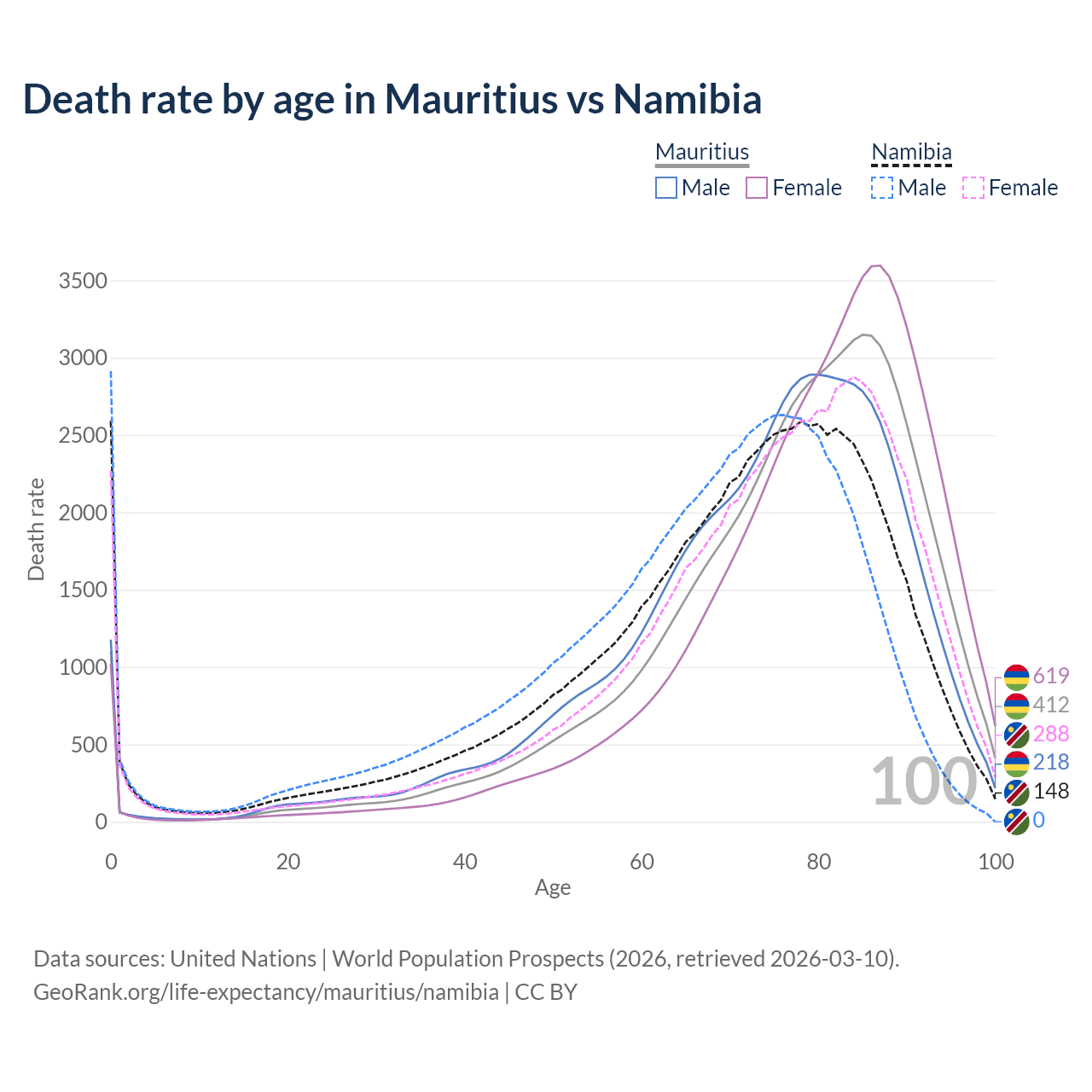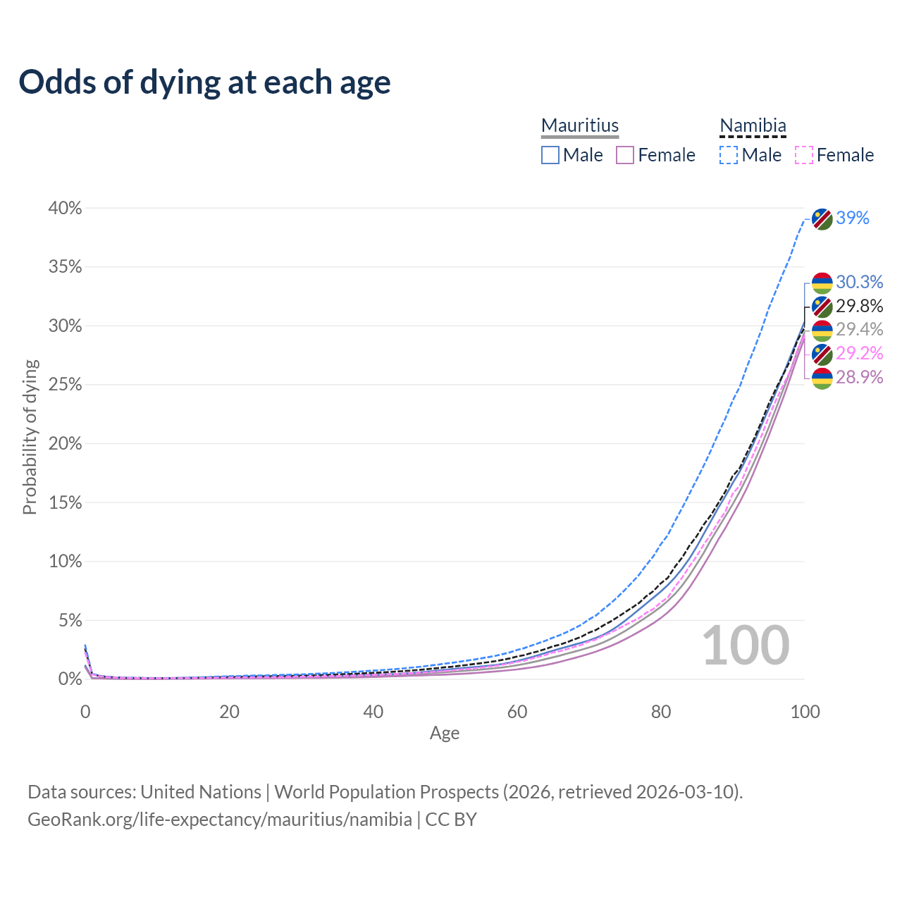 This life expectancy calculator shows the odds of living to 100, 95, 90, and below based on current age for both males and females in Mauritius and Namibia, along with mean and median age of death. The calculations are based on the 2026 life tables (actuarial tables) from the UN World Population Prospects.