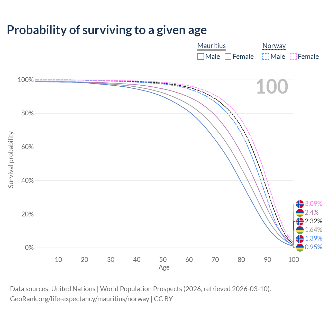 This life expectancy calculator shows the odds of living to 100, 95, 90, and below based on current age for both males and females in Mauritius and Norway, along with mean and median age of death. The calculations are based on the 2026 life tables (actuarial tables) from the UN World Population Prospects.