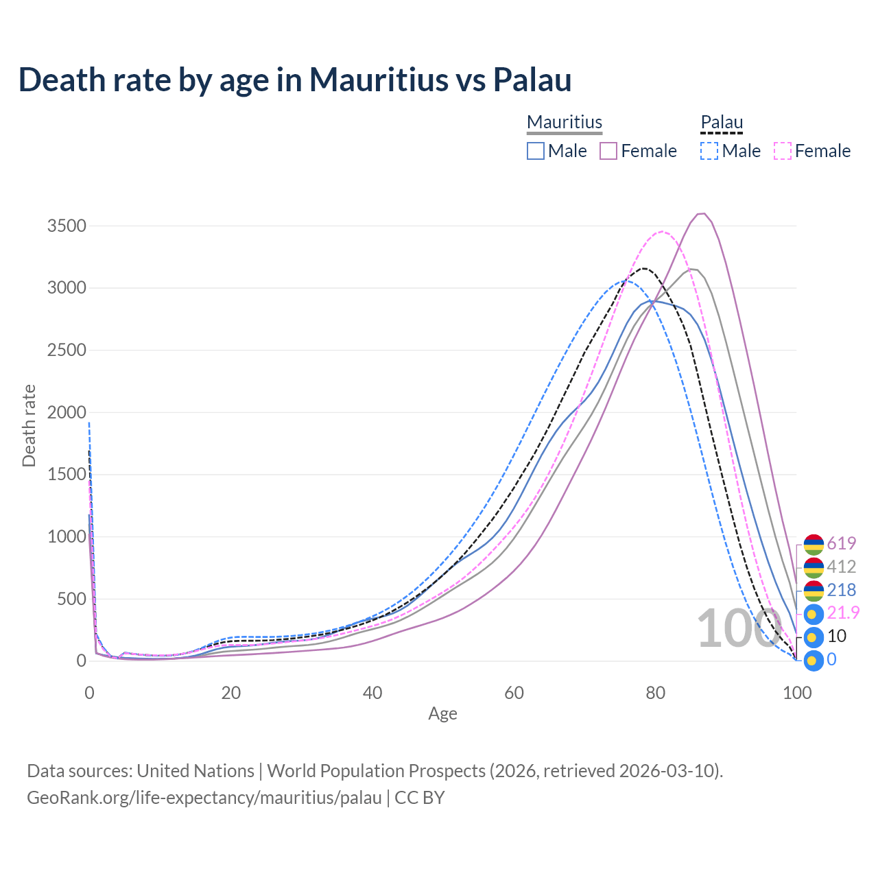 In Mauritius, the most common age of death is 85, compared to 78 in Palau. The median age of death is 79.1 in Mauritius and 73.8 in Palau, meaning only half of each cohort is expected to live past that age.