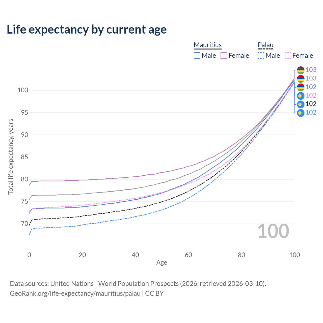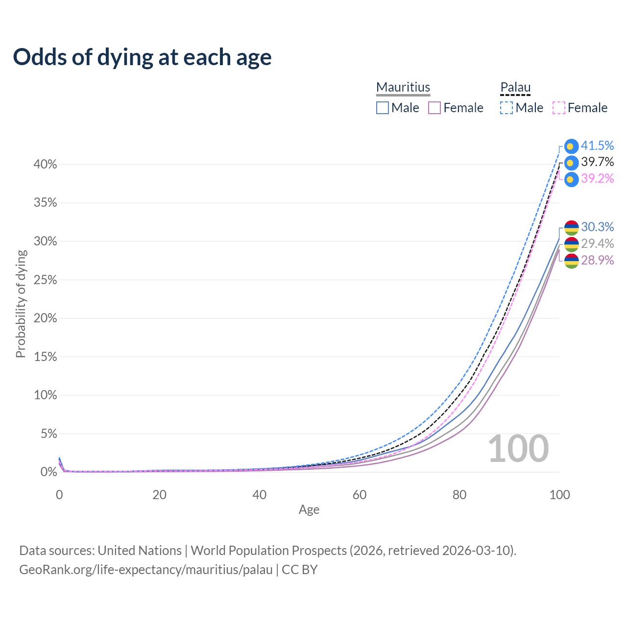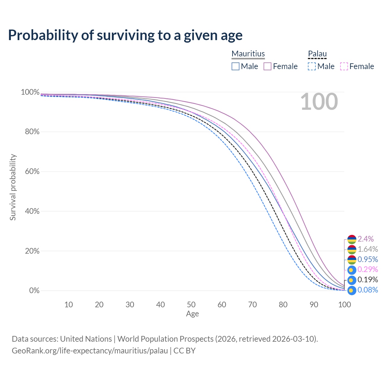 This life expectancy calculator shows the odds of living to 100, 95, 90, and below based on current age for both males and females in Mauritius and Palau, along with mean and median age of death. The calculations are based on the 2026 life tables (actuarial tables) from the UN World Population Prospects.