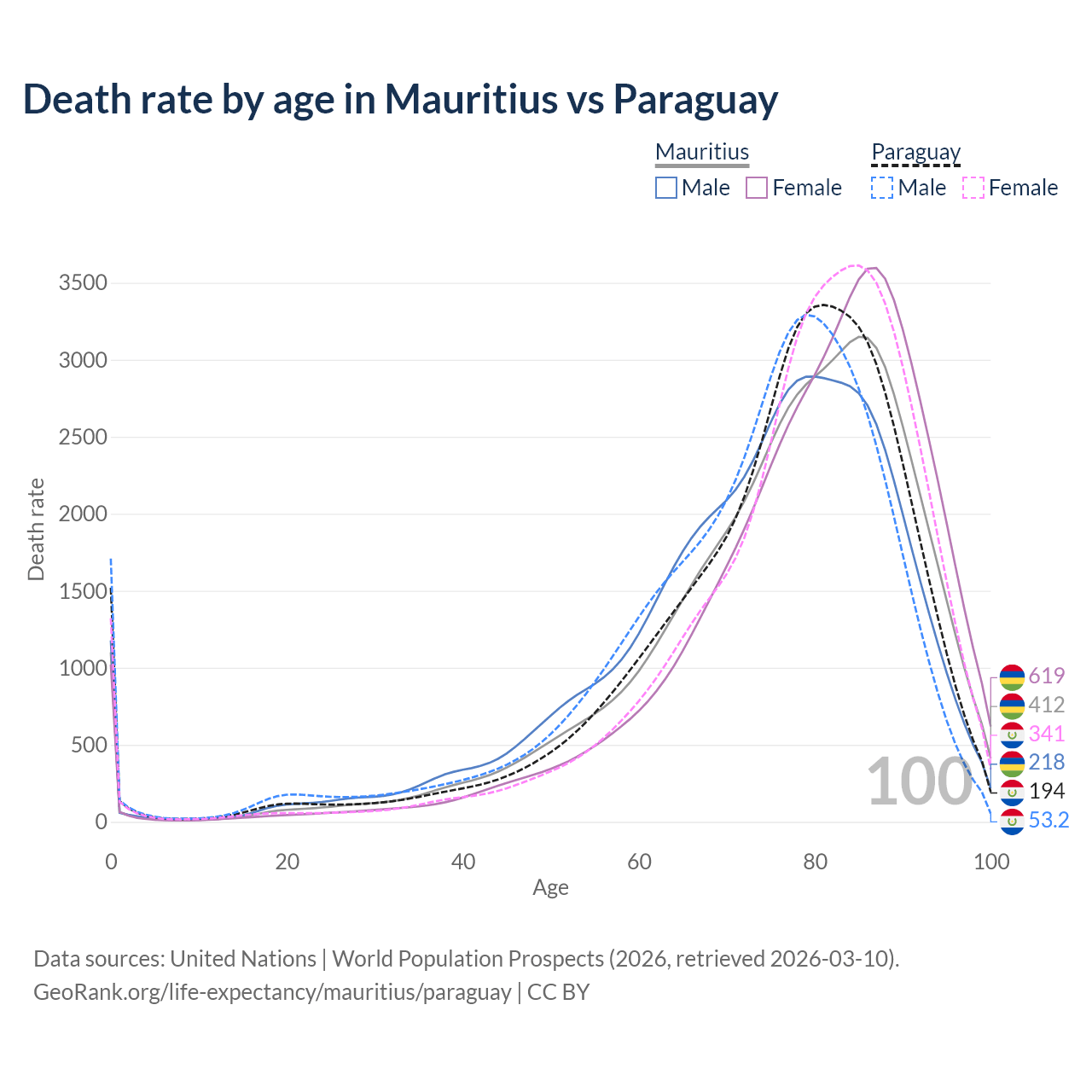 In Mauritius, the most common age of death is 85, compared to 81 in Paraguay. The median age of death is 79.1 in Mauritius and 78.4 in Paraguay, meaning only half of each cohort is expected to live past that age.
