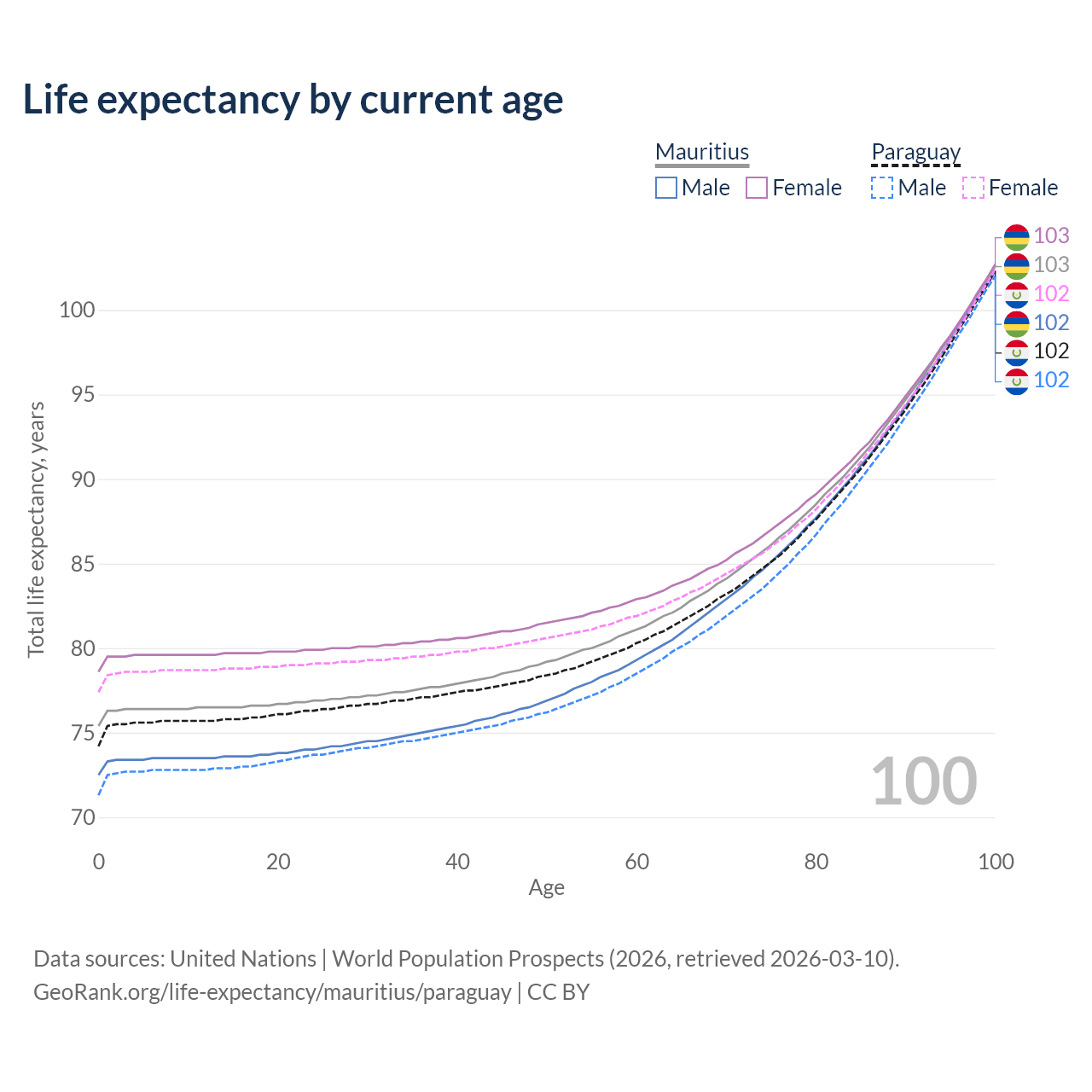 This life expectancy calculator shows the odds of living to 100, 95, 90, and below based on current age for both males and females in Mauritius and Paraguay, along with mean and median age of death. The calculations are based on the 2026 life tables (actuarial tables) from the UN World Population Prospects.
