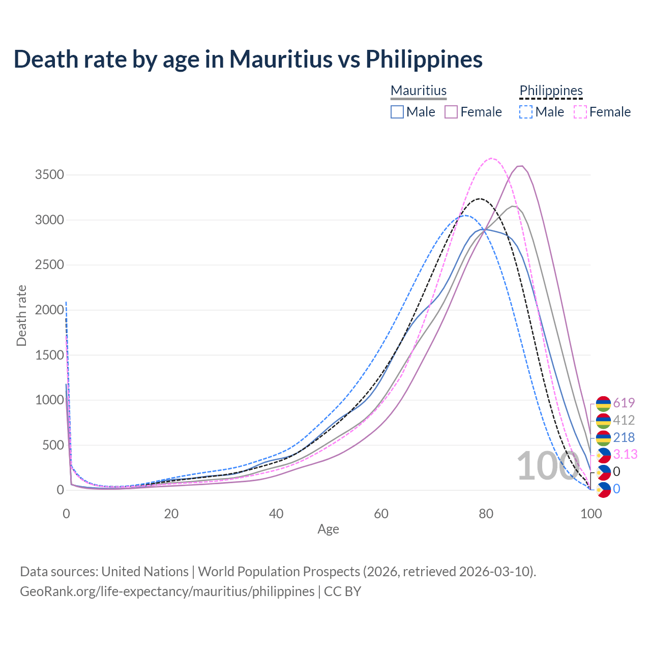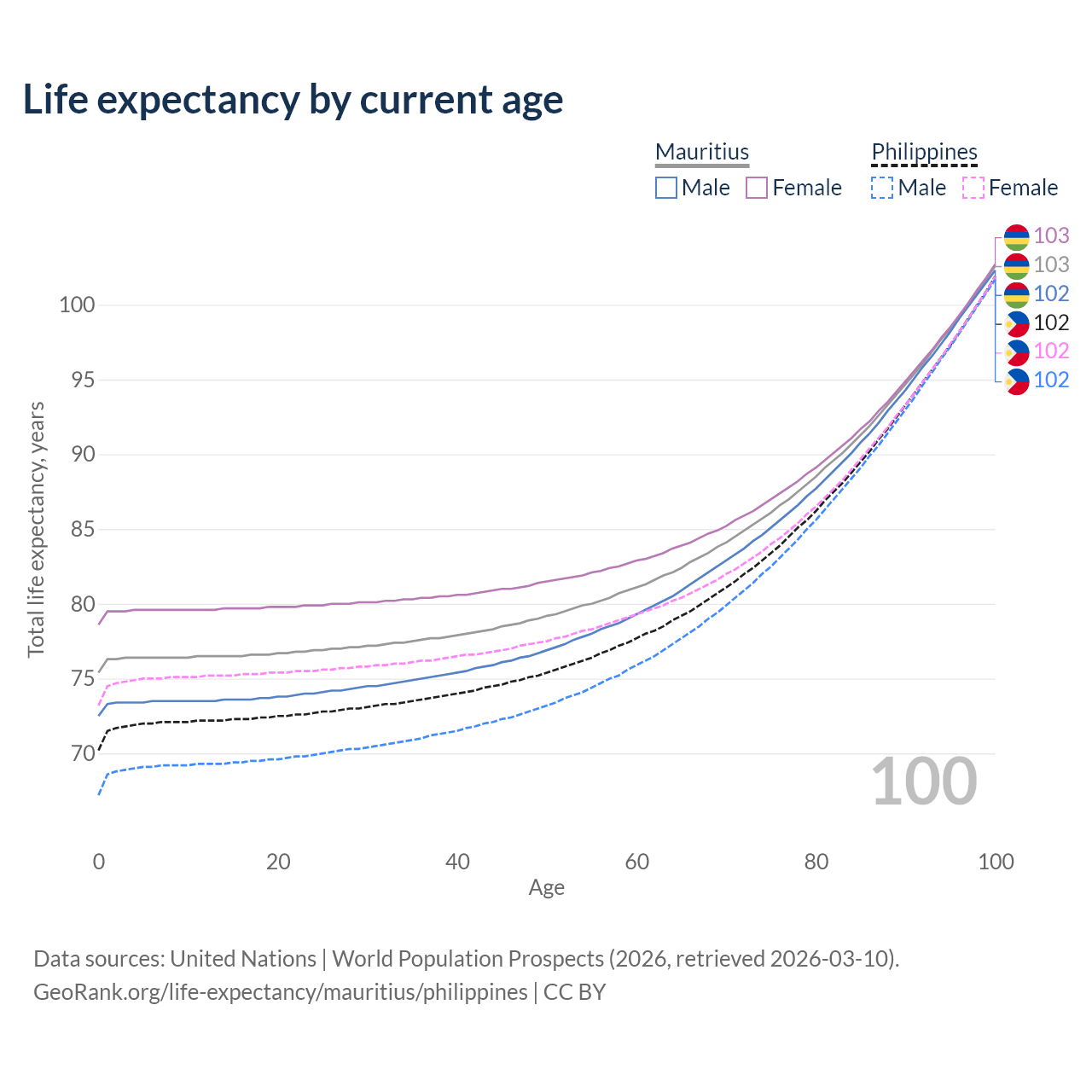 This life expectancy calculator shows the odds of living to 100, 95, 90, and below based on current age for both males and females in Mauritius and the Philippines, along with mean and median age of death. The calculations are based on the 2026 life tables (actuarial tables) from the UN World Population Prospects.