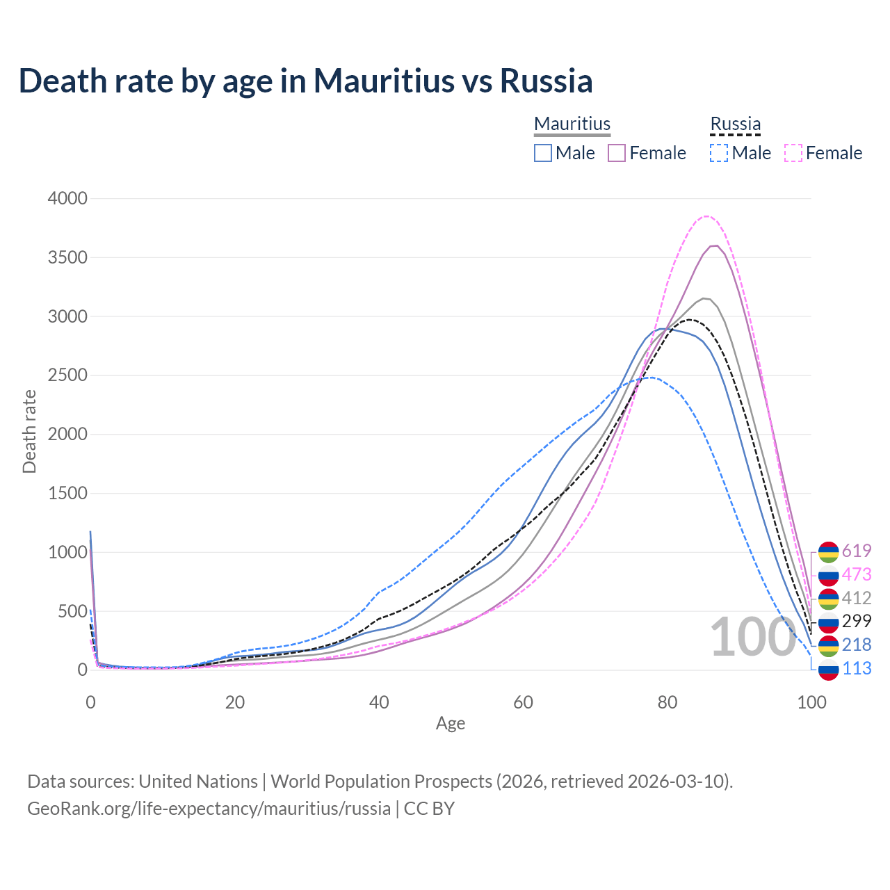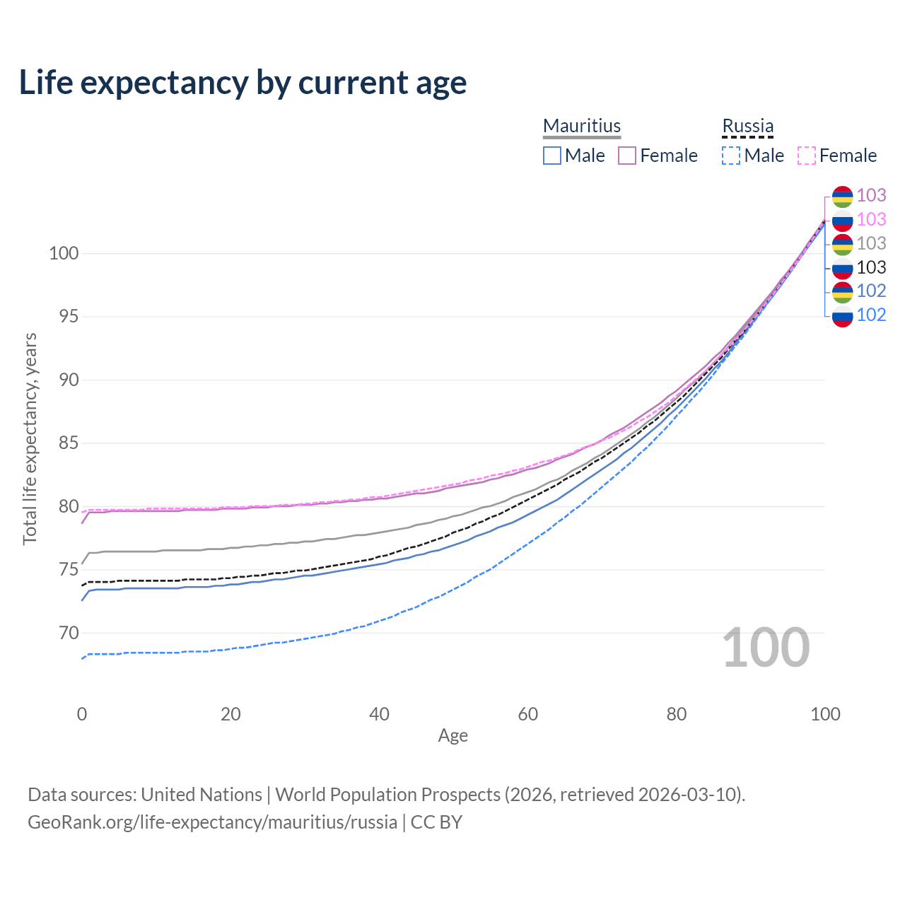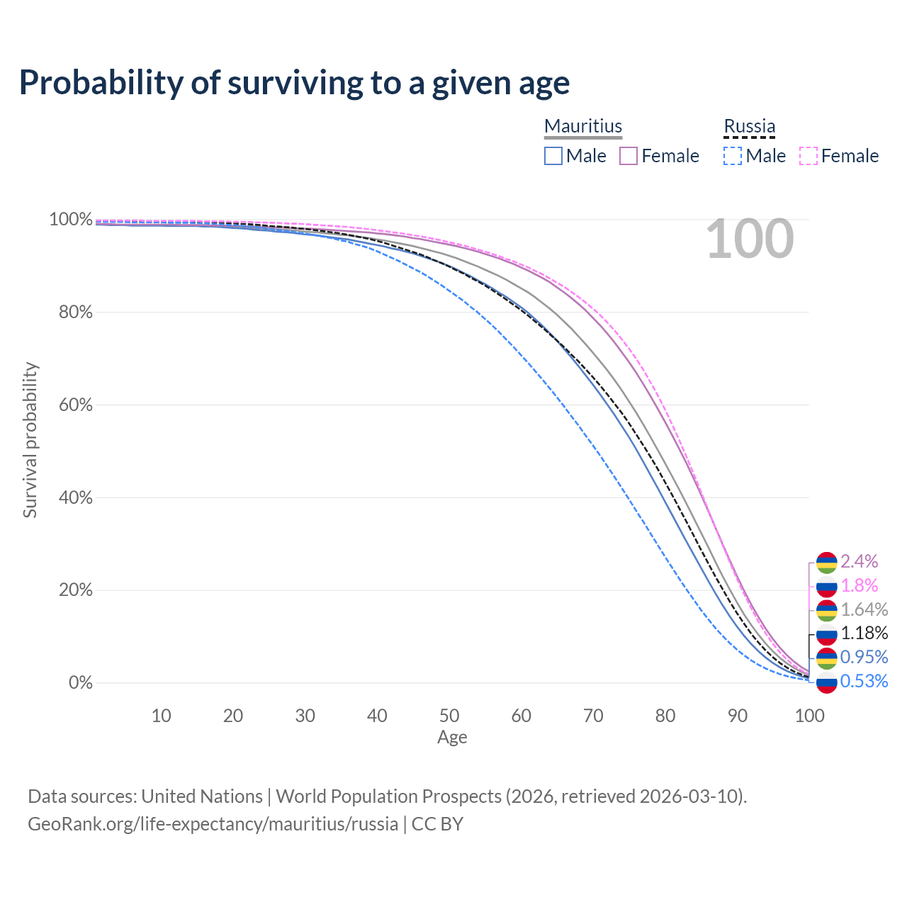 This life expectancy calculator shows the odds of living to 100, 95, 90, and below based on current age for both males and females in Mauritius and Russia, along with mean and median age of death. The calculations are based on the 2026 life tables (actuarial tables) from the UN World Population Prospects.
