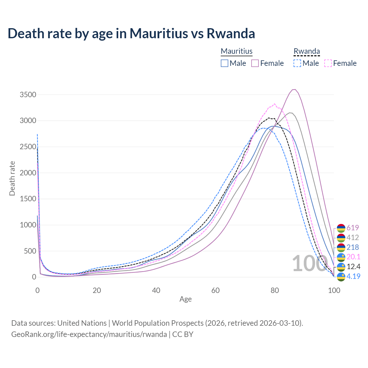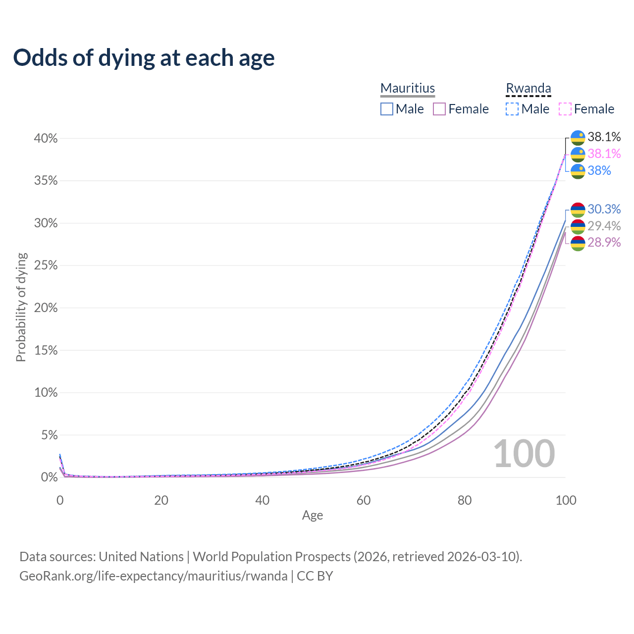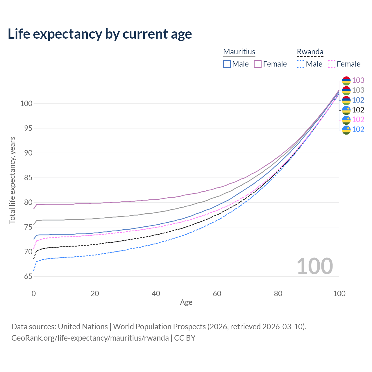 This life expectancy calculator shows the odds of living to 100, 95, 90, and below based on current age for both males and females in Mauritius and Rwanda, along with mean and median age of death. The calculations are based on the 2026 life tables (actuarial tables) from the UN World Population Prospects.