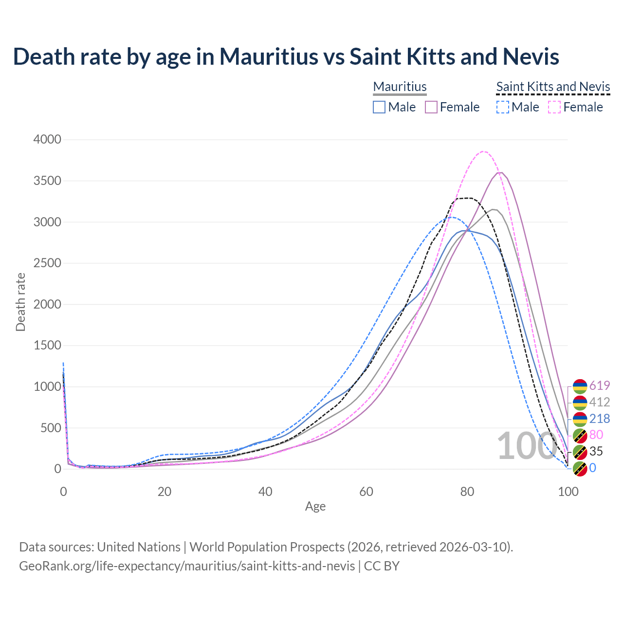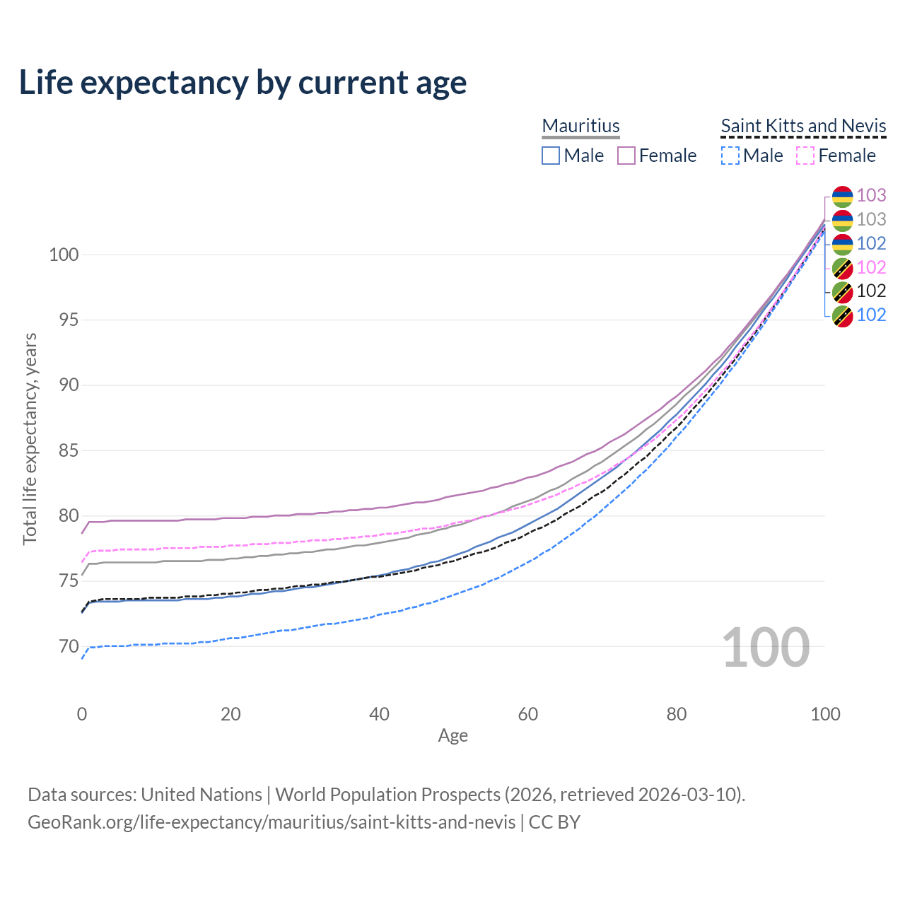 This life expectancy calculator shows the odds of living to 100, 95, 90, and below based on current age for both males and females in Mauritius and Saint Kitts and Nevis, along with mean and median age of death. The calculations are based on the 2026 life tables (actuarial tables) from the UN World Population Prospects.