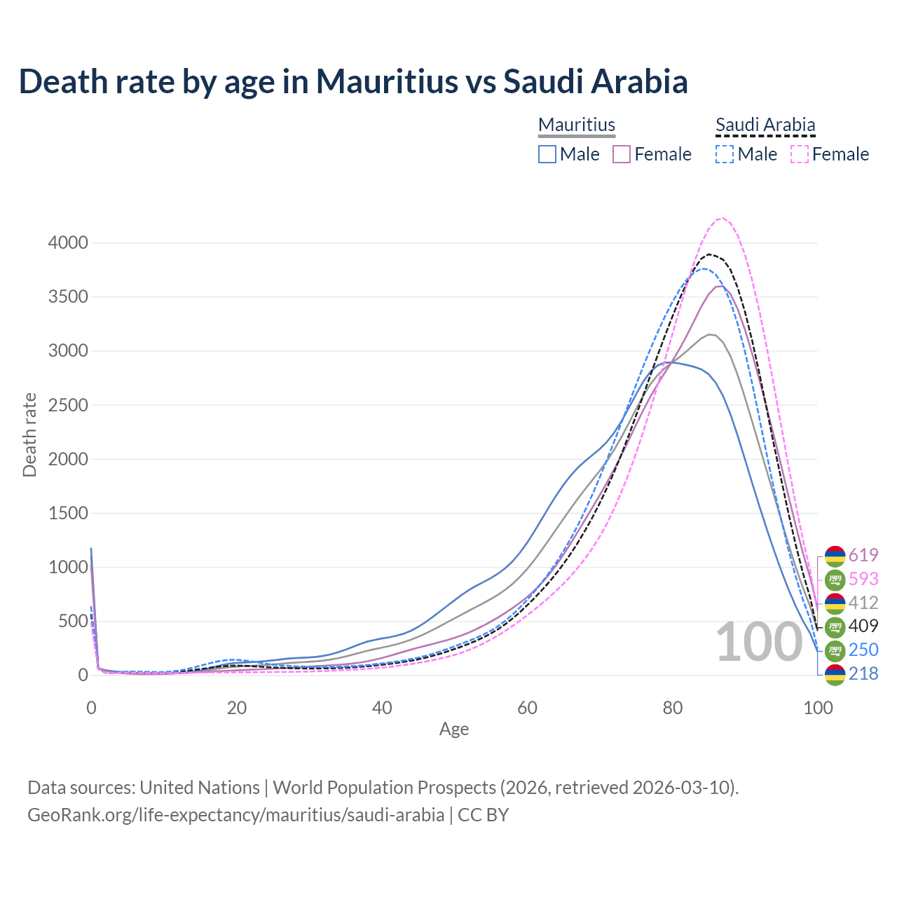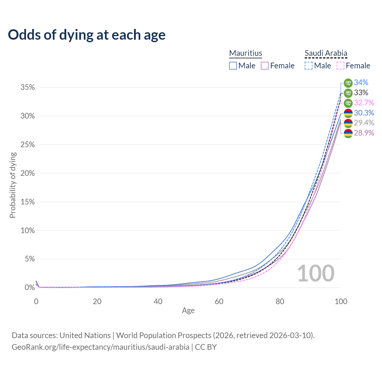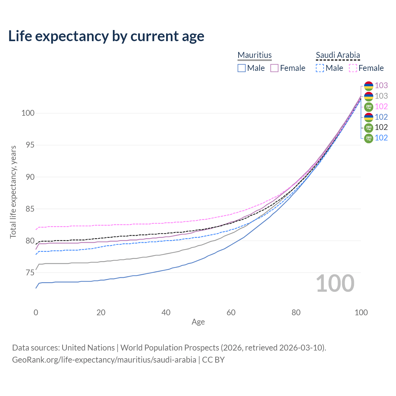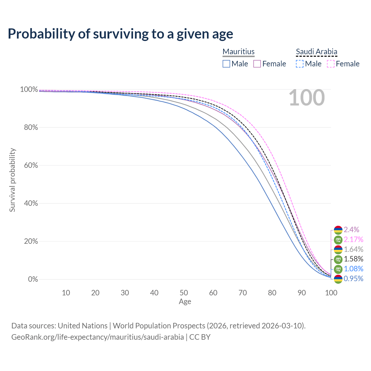 This life expectancy calculator shows the odds of living to 100, 95, 90, and below based on current age for both males and females in Mauritius and Saudi Arabia, along with mean and median age of death. The calculations are based on the 2026 life tables (actuarial tables) from the UN World Population Prospects.
