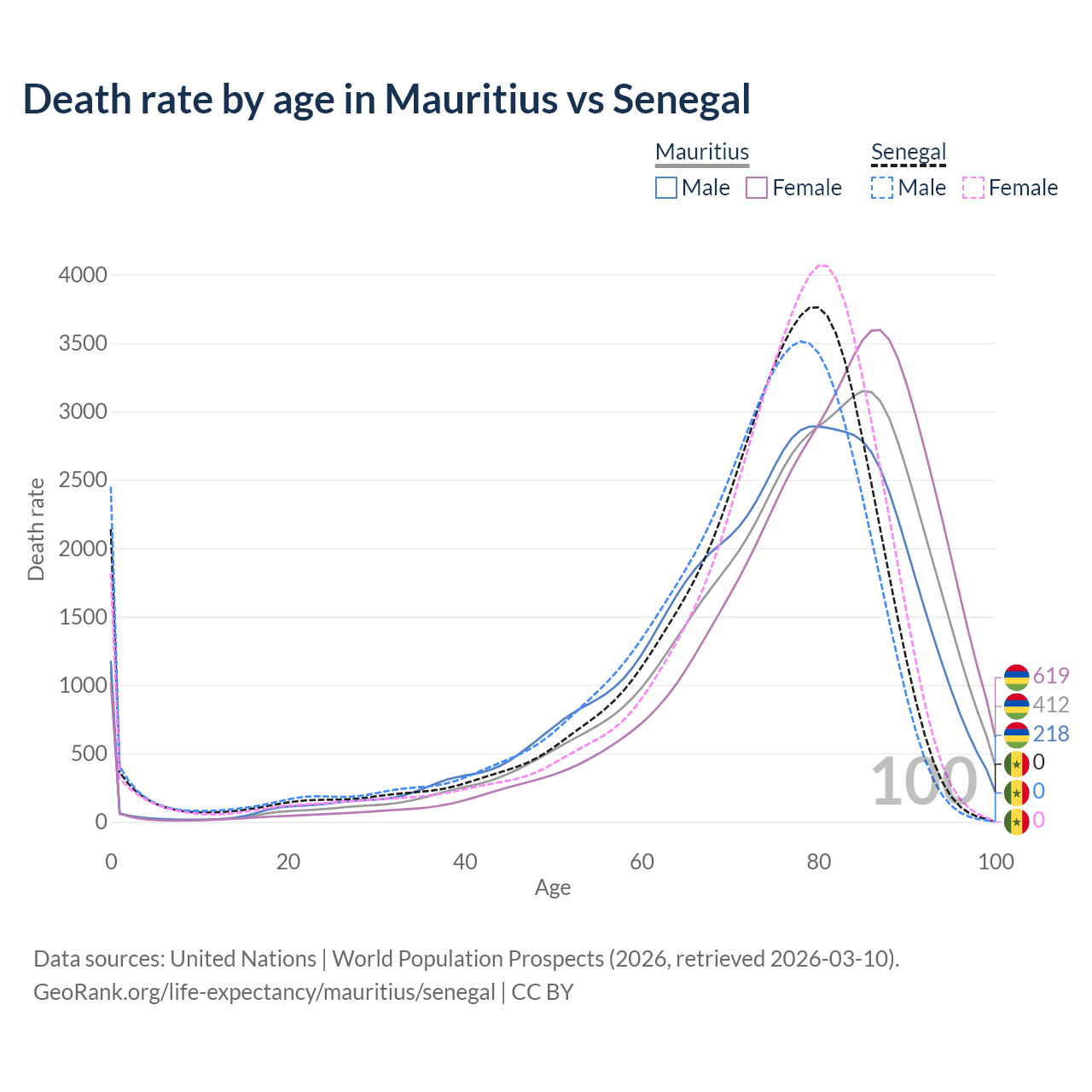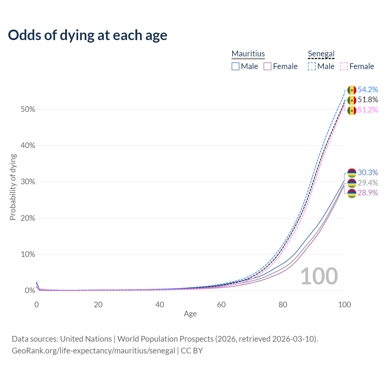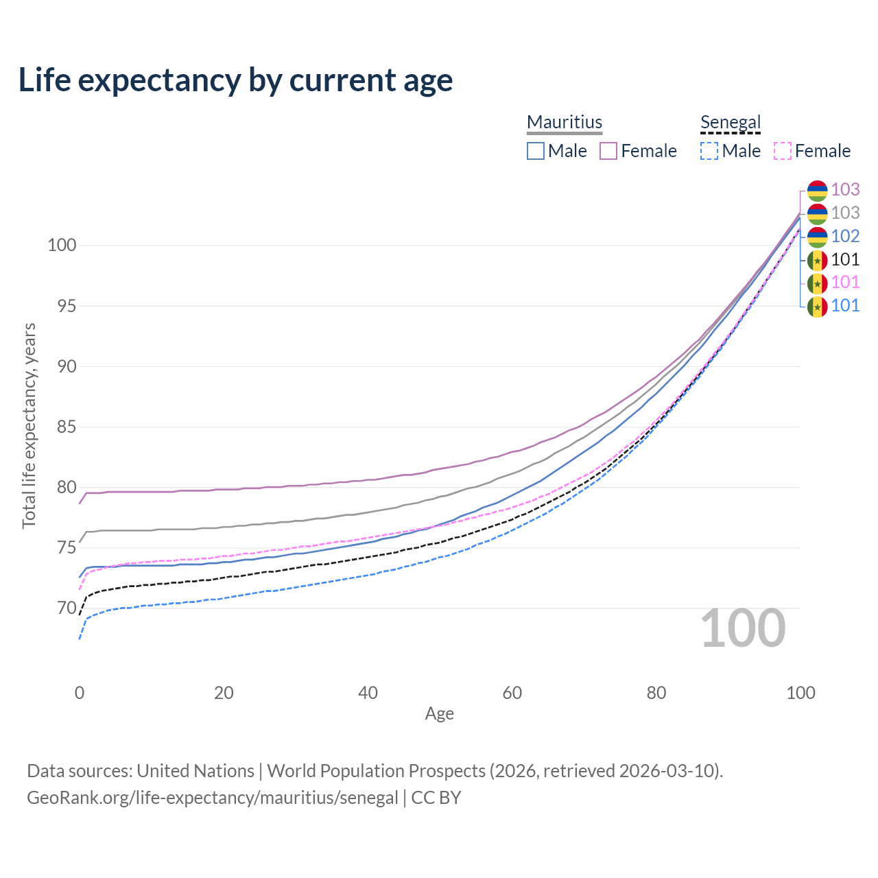 This life expectancy calculator shows the odds of living to 100, 95, 90, and below based on current age for both males and females in Mauritius and Senegal, along with mean and median age of death. The calculations are based on the 2026 life tables (actuarial tables) from the UN World Population Prospects.