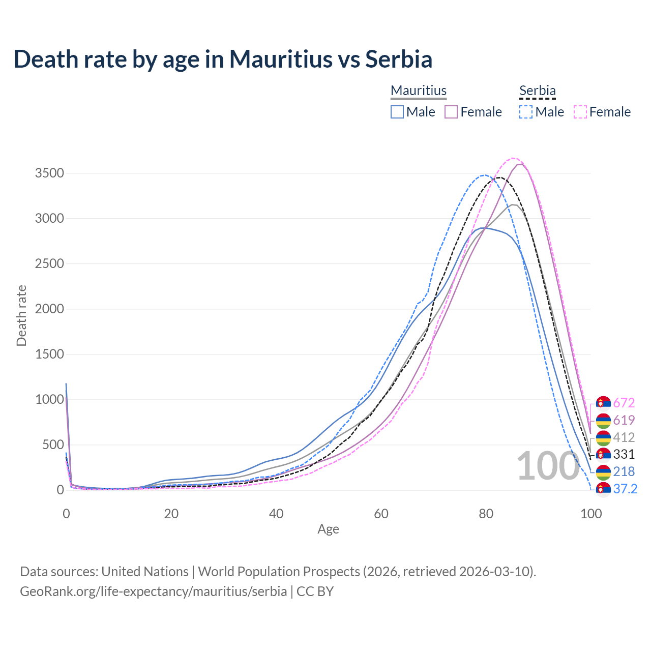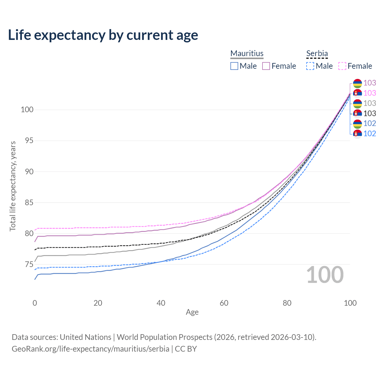This life expectancy calculator shows the odds of living to 100, 95, 90, and below based on current age for both males and females in Mauritius and Serbia, along with mean and median age of death. The calculations are based on the 2026 life tables (actuarial tables) from the UN World Population Prospects.