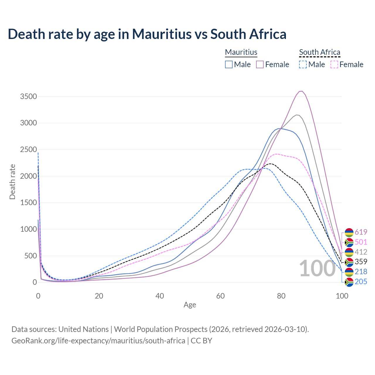 In Mauritius, the most common age of death is 85, compared to 77 in South Africa. The median age of death is 79.1 in Mauritius and 70.8 in South Africa, meaning only half of each cohort is expected to live past that age.