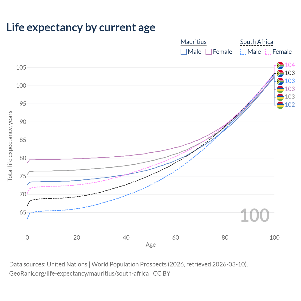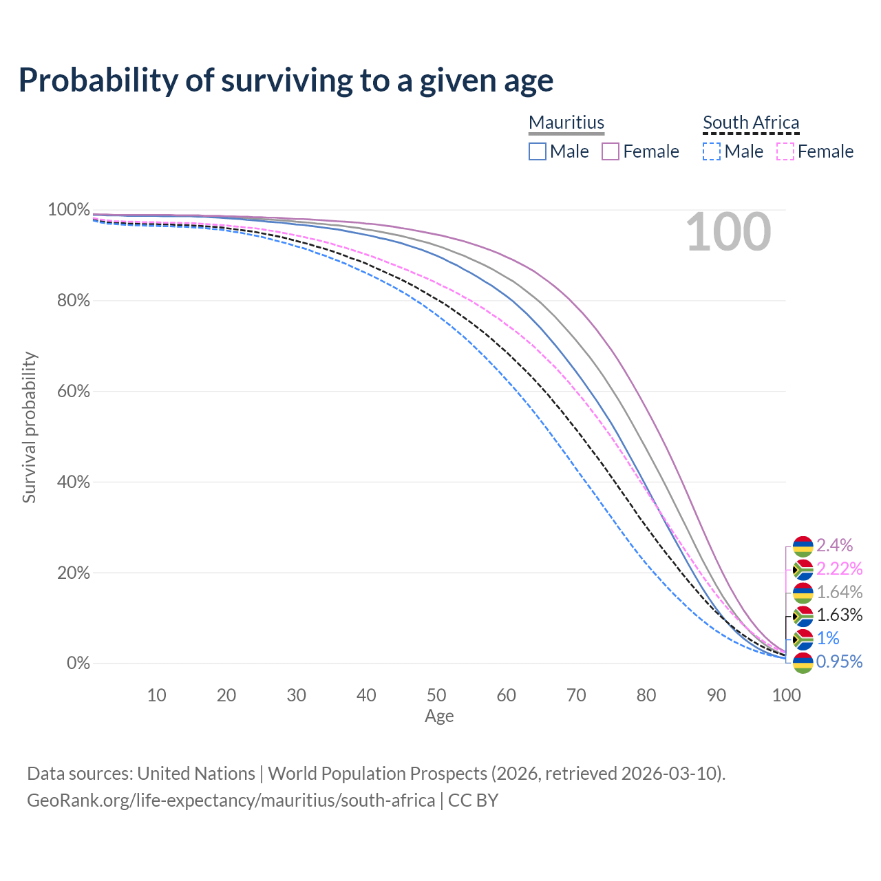 This life expectancy calculator shows the odds of living to 100, 95, 90, and below based on current age for both males and females in Mauritius and South Africa, along with mean and median age of death. The calculations are based on the 2026 life tables (actuarial tables) from the UN World Population Prospects.