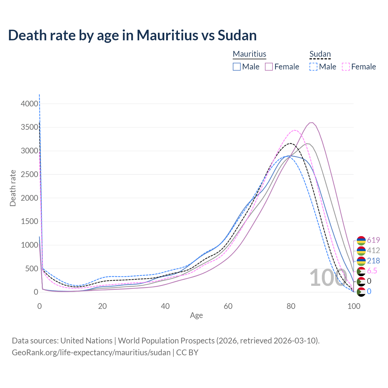 In Mauritius, the most common age of death is 85, compared to 0 in Sudan. The median age of death is 79.1 in Mauritius and 74.1 in Sudan, meaning only half of each cohort is expected to live past that age.