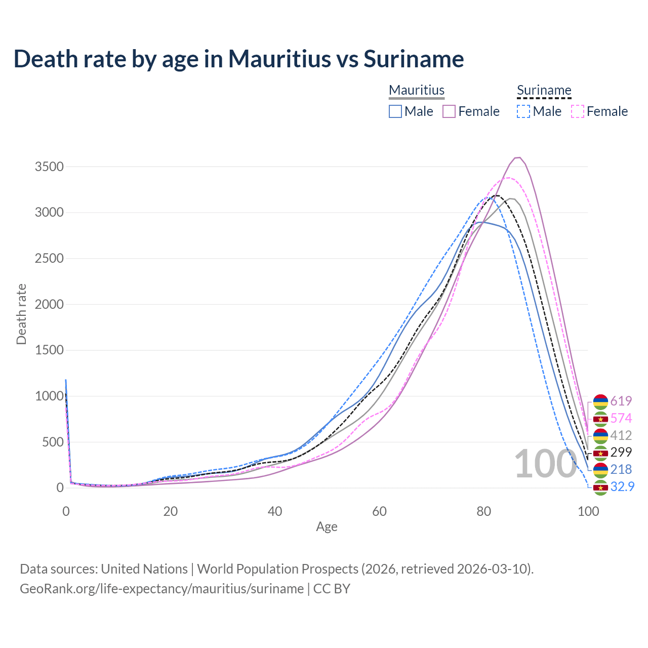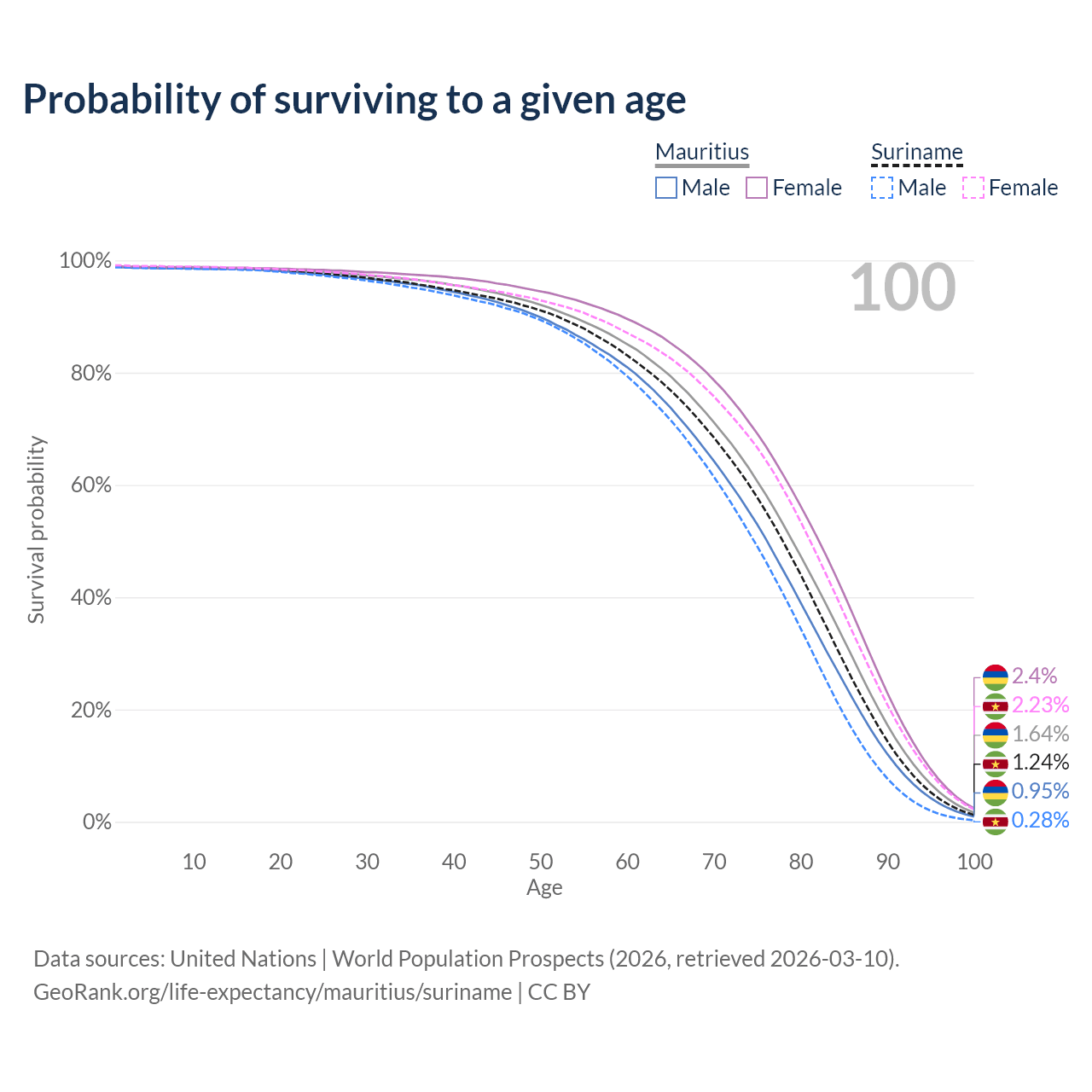 This life expectancy calculator shows the odds of living to 100, 95, 90, and below based on current age for both males and females in Mauritius and Suriname, along with mean and median age of death. The calculations are based on the 2026 life tables (actuarial tables) from the UN World Population Prospects.