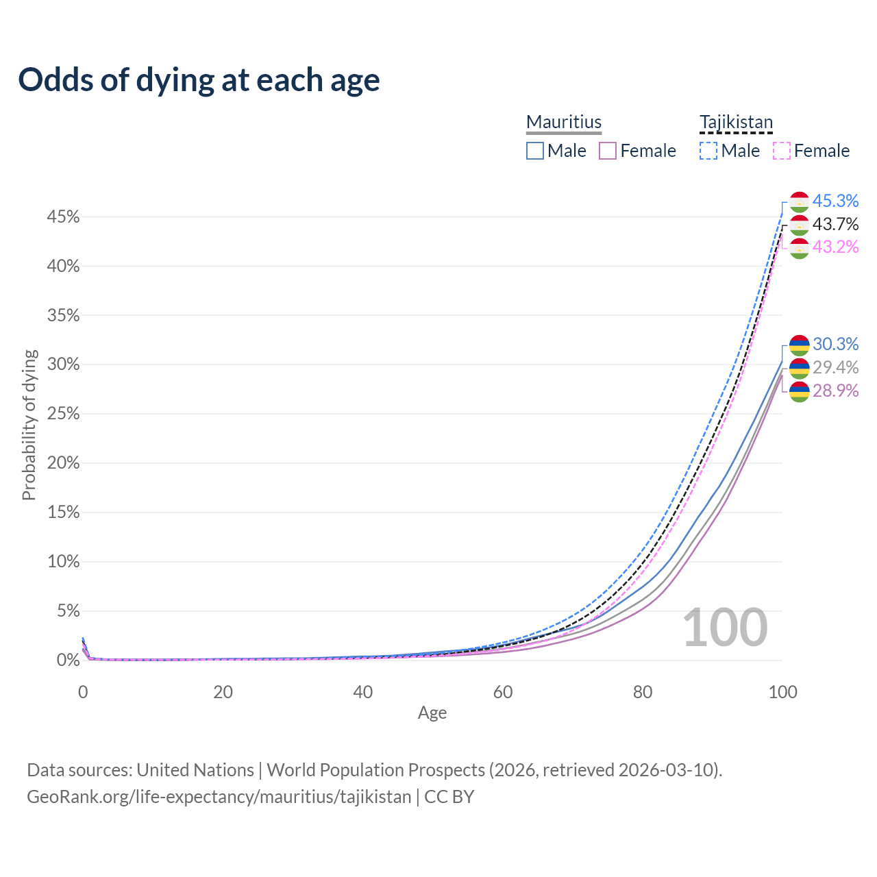 This life expectancy calculator shows the odds of living to 100, 95, 90, and below based on current age for both males and females in Mauritius and Tajikistan, along with mean and median age of death. The calculations are based on the 2026 life tables (actuarial tables) from the UN World Population Prospects.