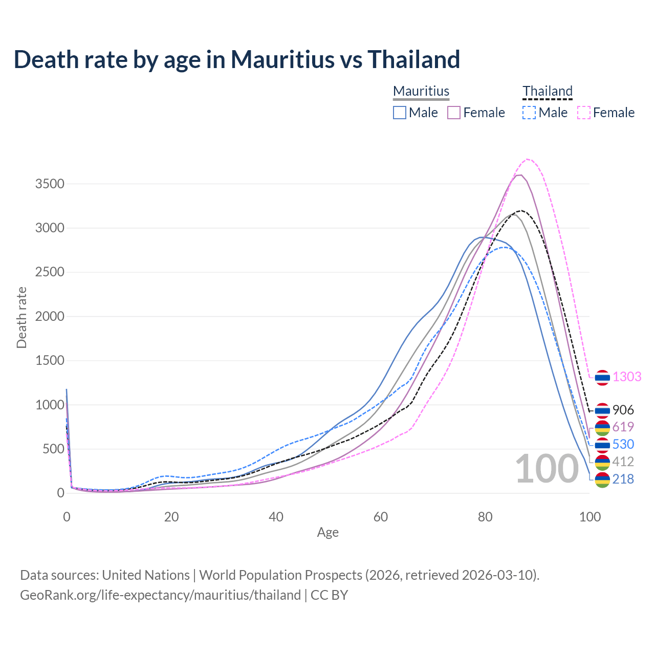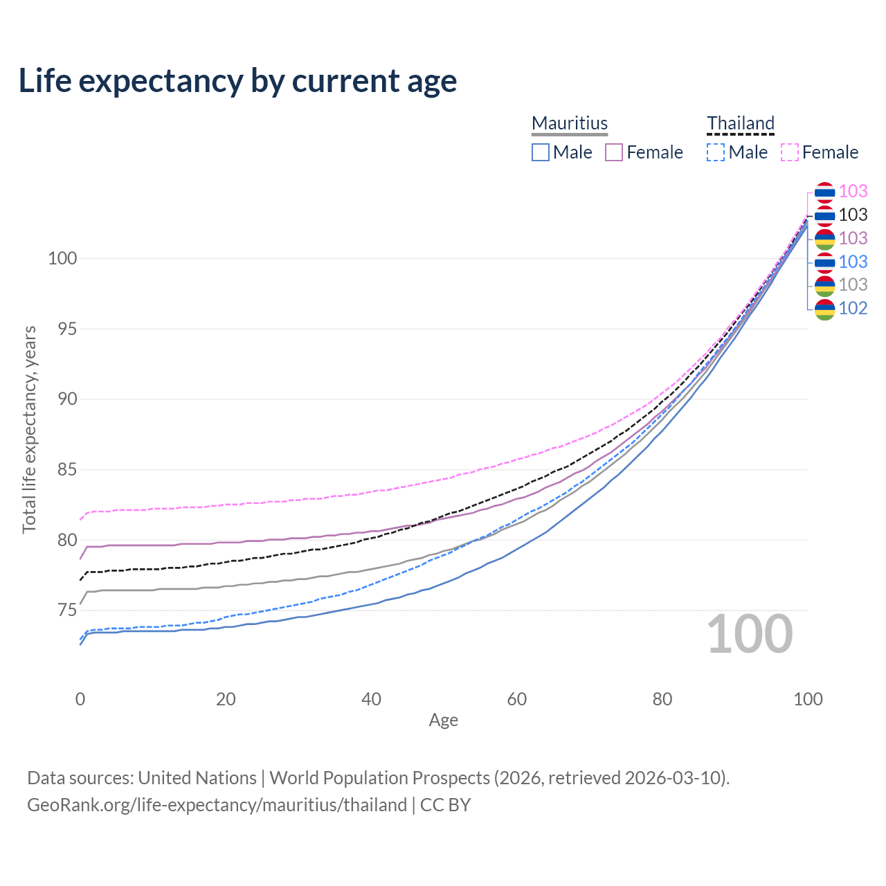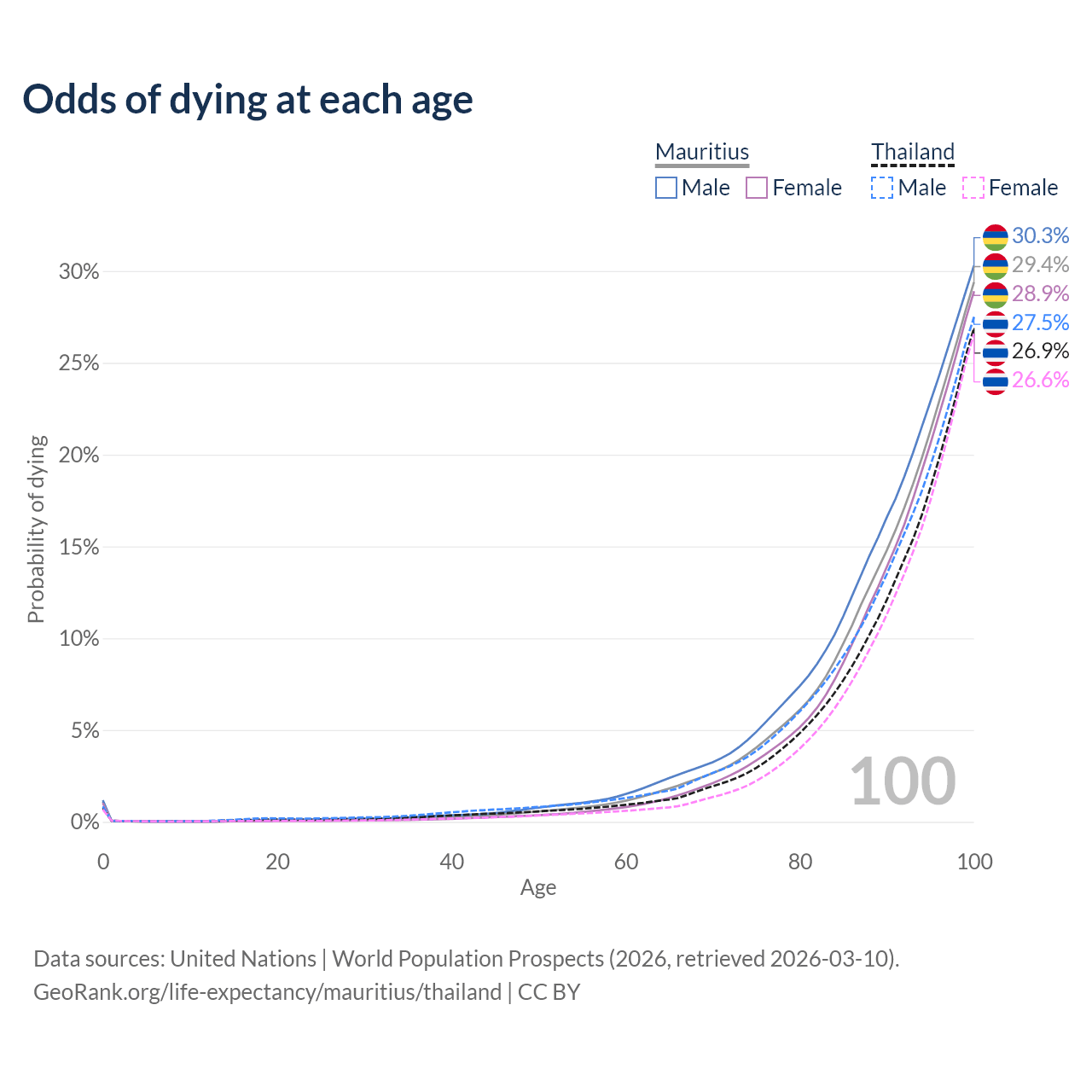 This life expectancy calculator shows the odds of living to 100, 95, 90, and below based on current age for both males and females in Mauritius and Thailand, along with mean and median age of death. The calculations are based on the 2026 life tables (actuarial tables) from the UN World Population Prospects.
