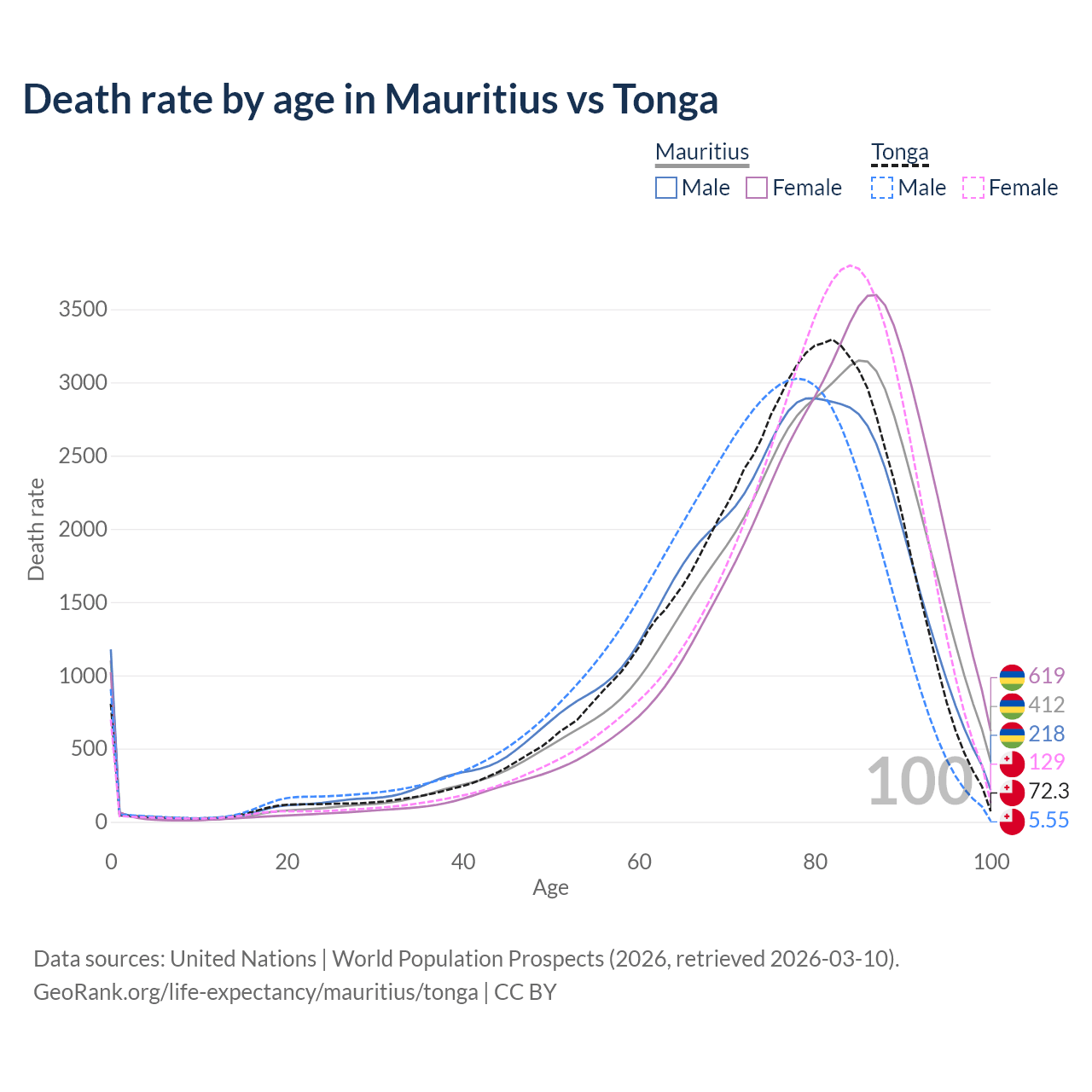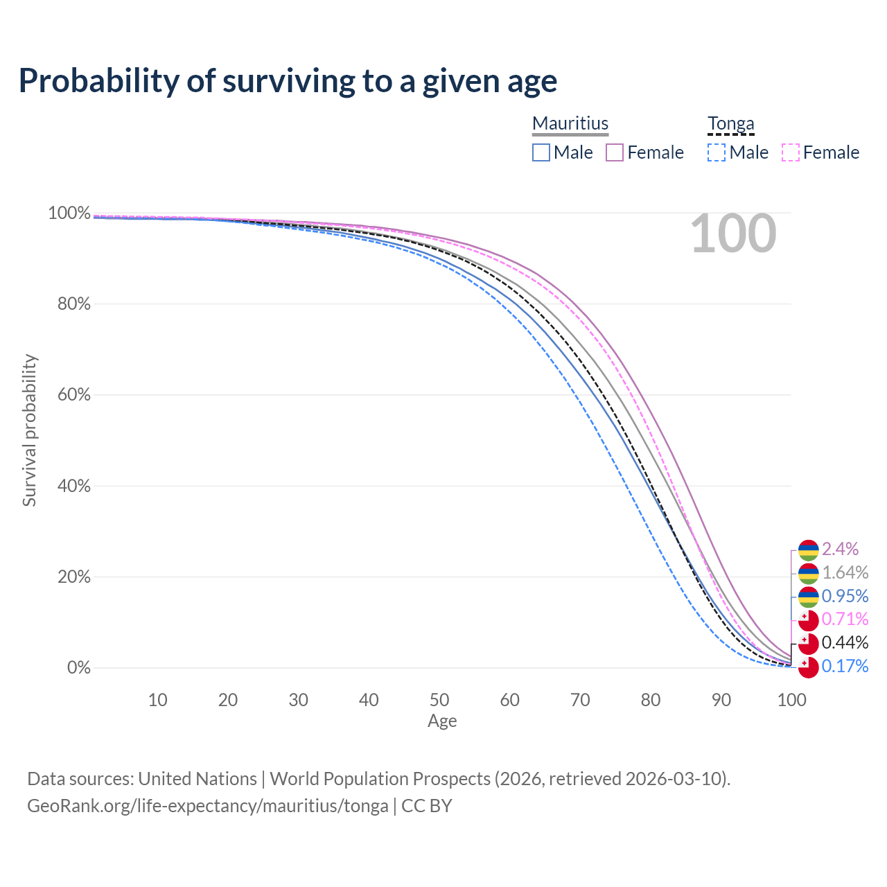This life expectancy calculator shows the odds of living to 100, 95, 90, and below based on current age for both males and females in Mauritius and Tonga, along with mean and median age of death. The calculations are based on the 2026 life tables (actuarial tables) from the UN World Population Prospects.
