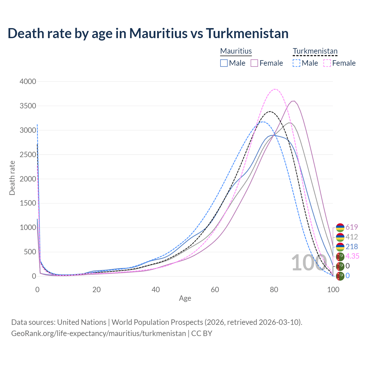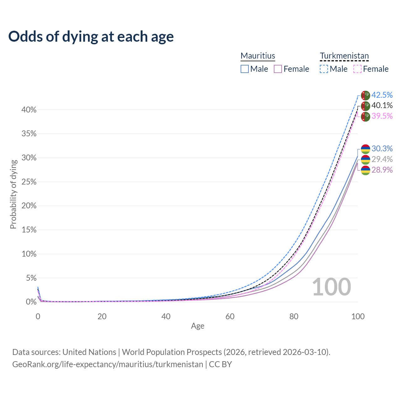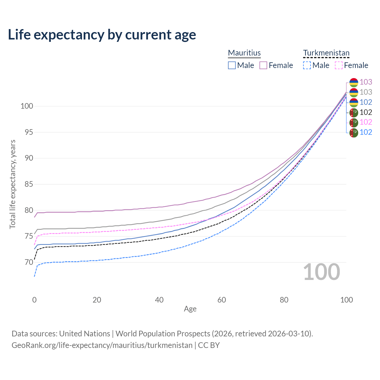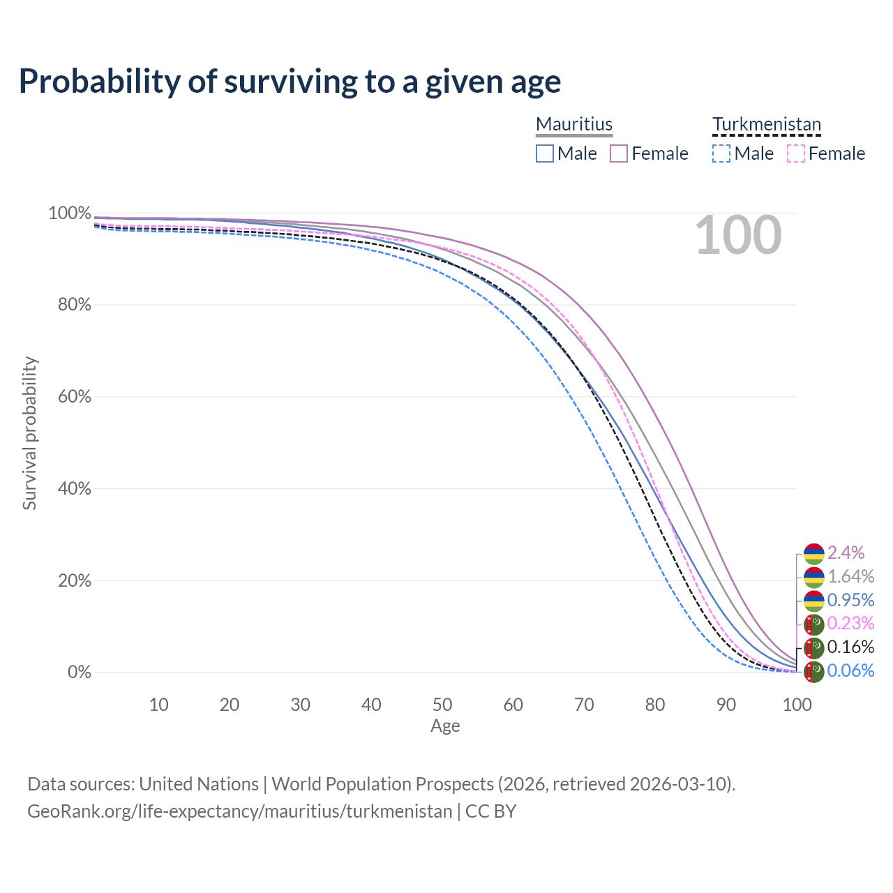This life expectancy calculator shows the odds of living to 100, 95, 90, and below based on current age for both males and females in Mauritius and Turkmenistan, along with mean and median age of death. The calculations are based on the 2026 life tables (actuarial tables) from the UN World Population Prospects.