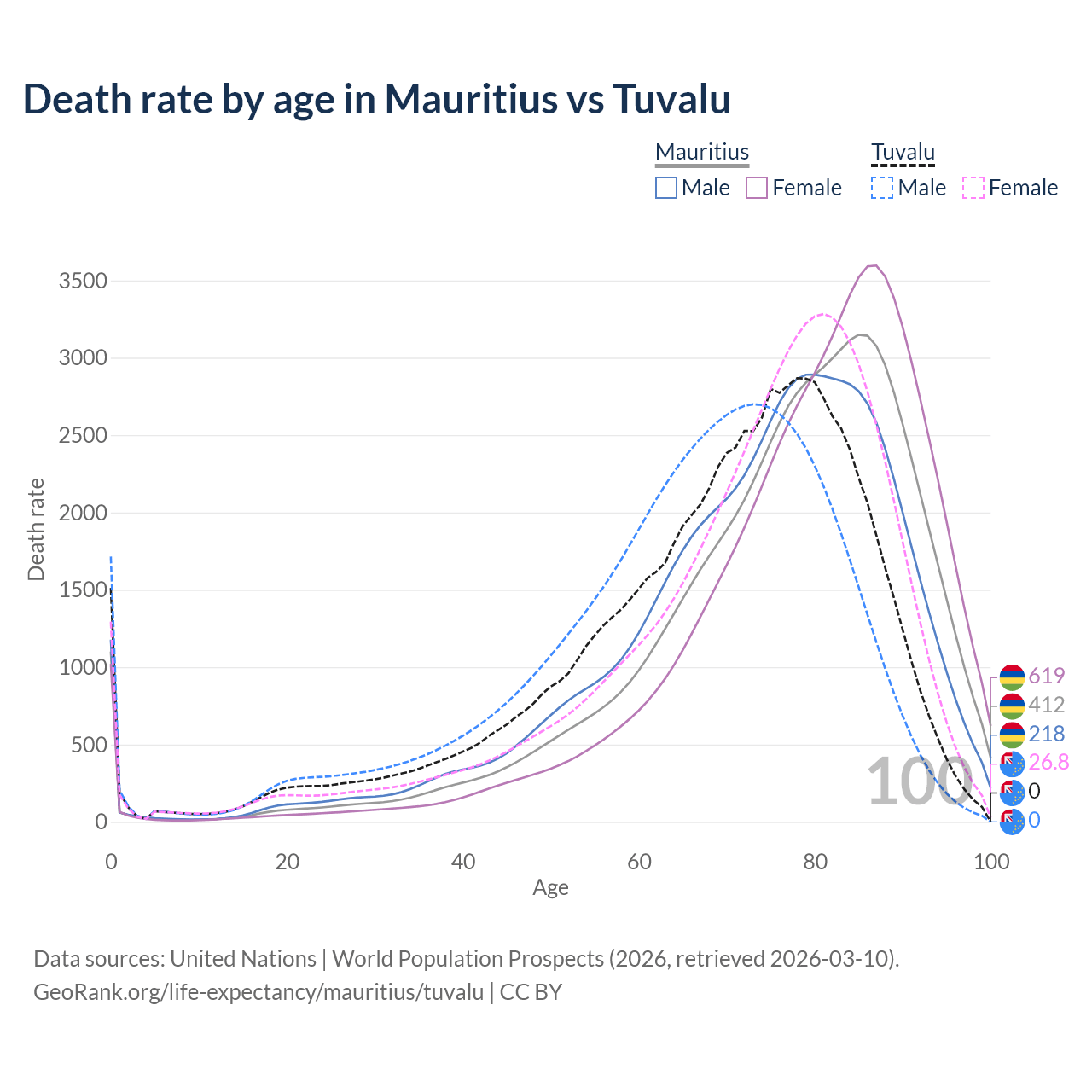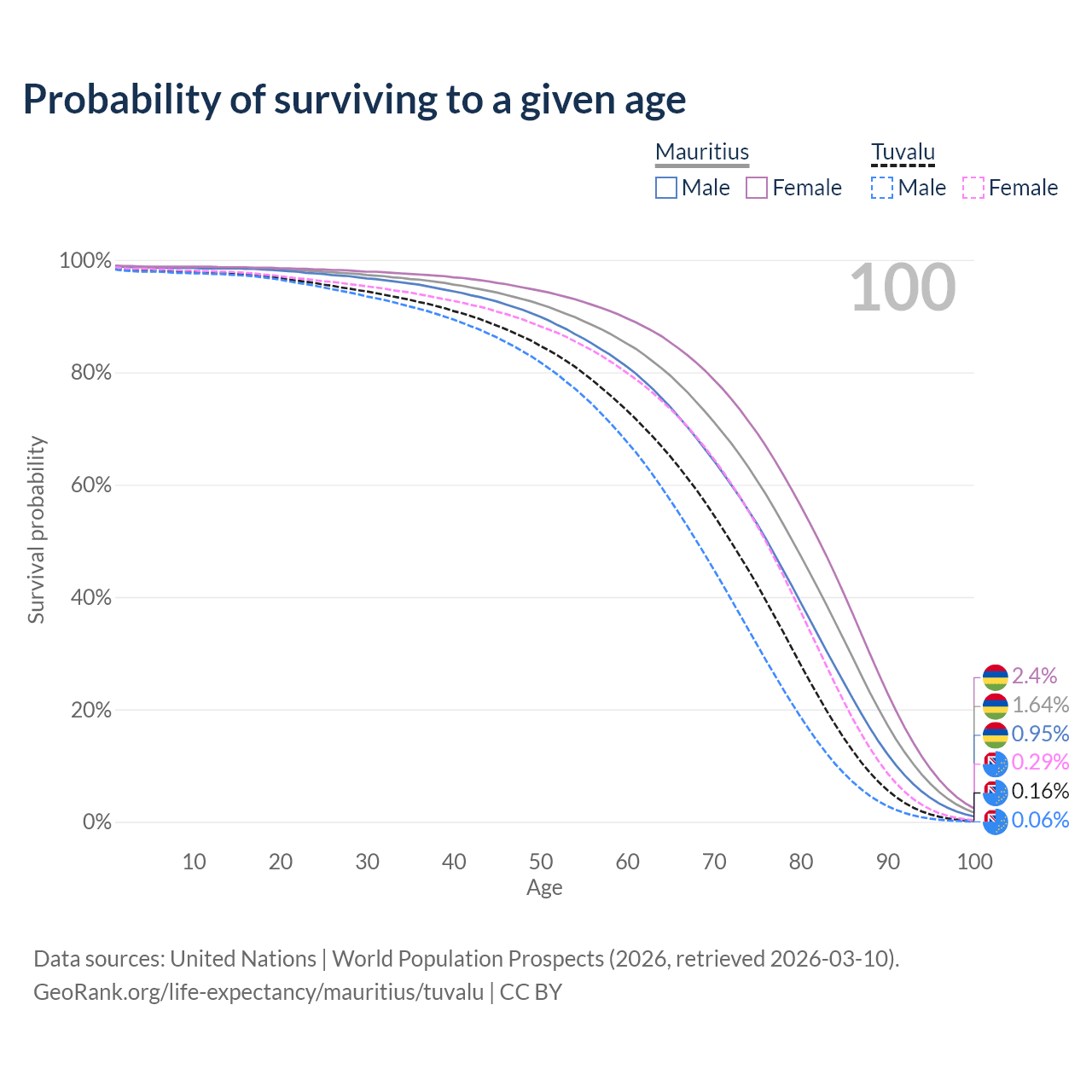 This life expectancy calculator shows the odds of living to 100, 95, 90, and below based on current age for both males and females in Mauritius and Tuvalu, along with mean and median age of death. The calculations are based on the 2026 life tables (actuarial tables) from the UN World Population Prospects.