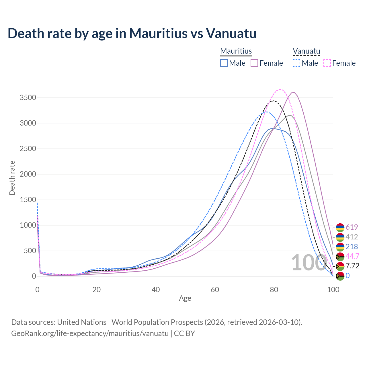 In Mauritius, the most common age of death is 85, compared to 80 in Vanuatu. The median age of death is 79.1 in Mauritius and 75.9 in Vanuatu, meaning only half of each cohort is expected to live past that age.